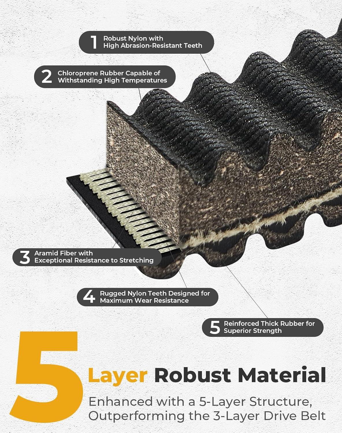 5-Layer Composition : Crafted with a robust 5-layer design, this continuously variable transmission belt incorporates dual nylon tooth coatings, a reinforced double-thick layer of neoprene rubber, and woven aramid fibers. This construction is optimized for resistance against the demanding conditions encountered during off-road use