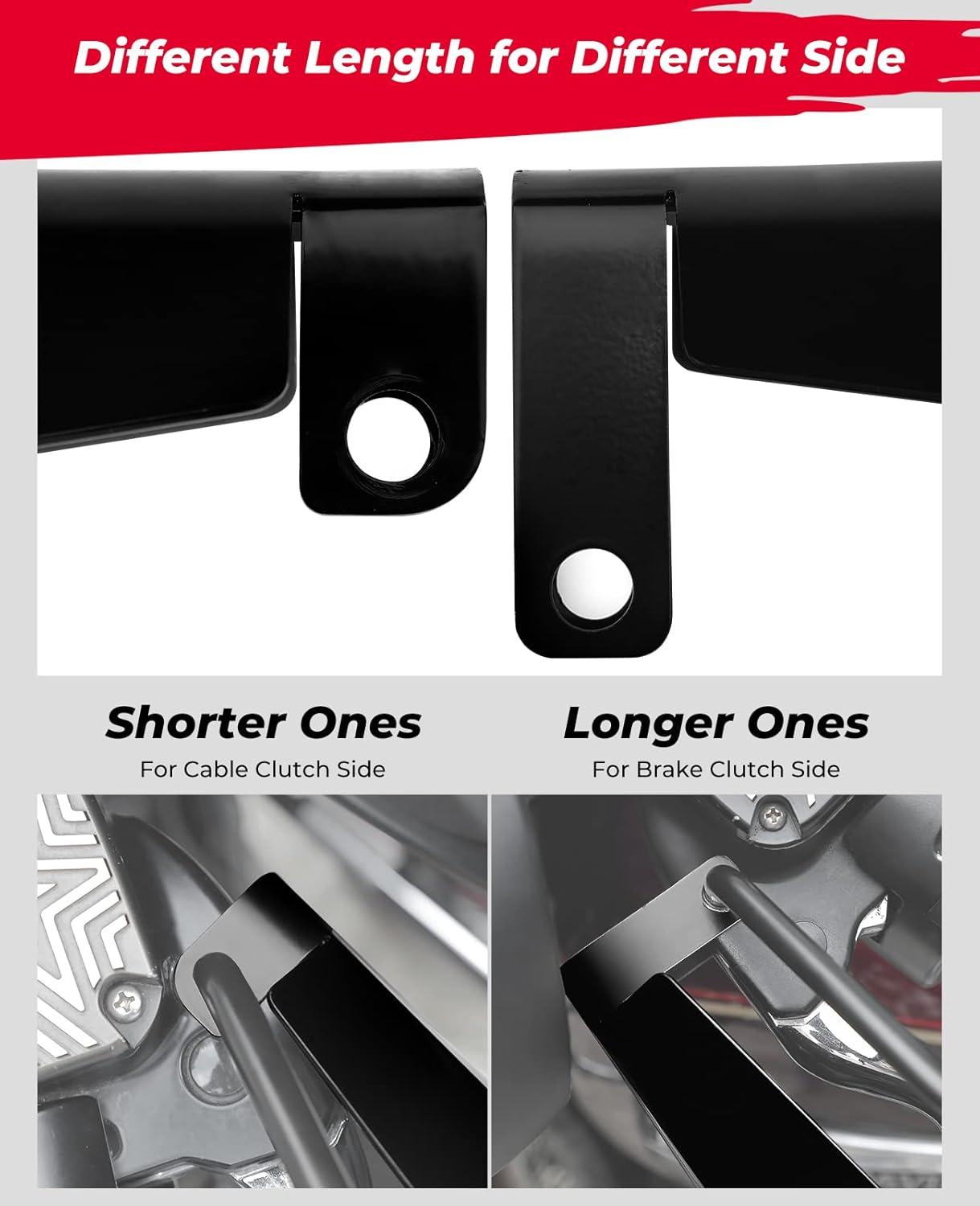 Note: One of the motorcycle hand guards wind protector has a longer mounting tag, it goes on the cable clutch side, and the short one goes on the brake side. If you run a 2014 or Newer baggers with hydraulic clutch, you don't need a pair of mounting tabs in different sizes. If you mind the appearance, you might need to modify the long one