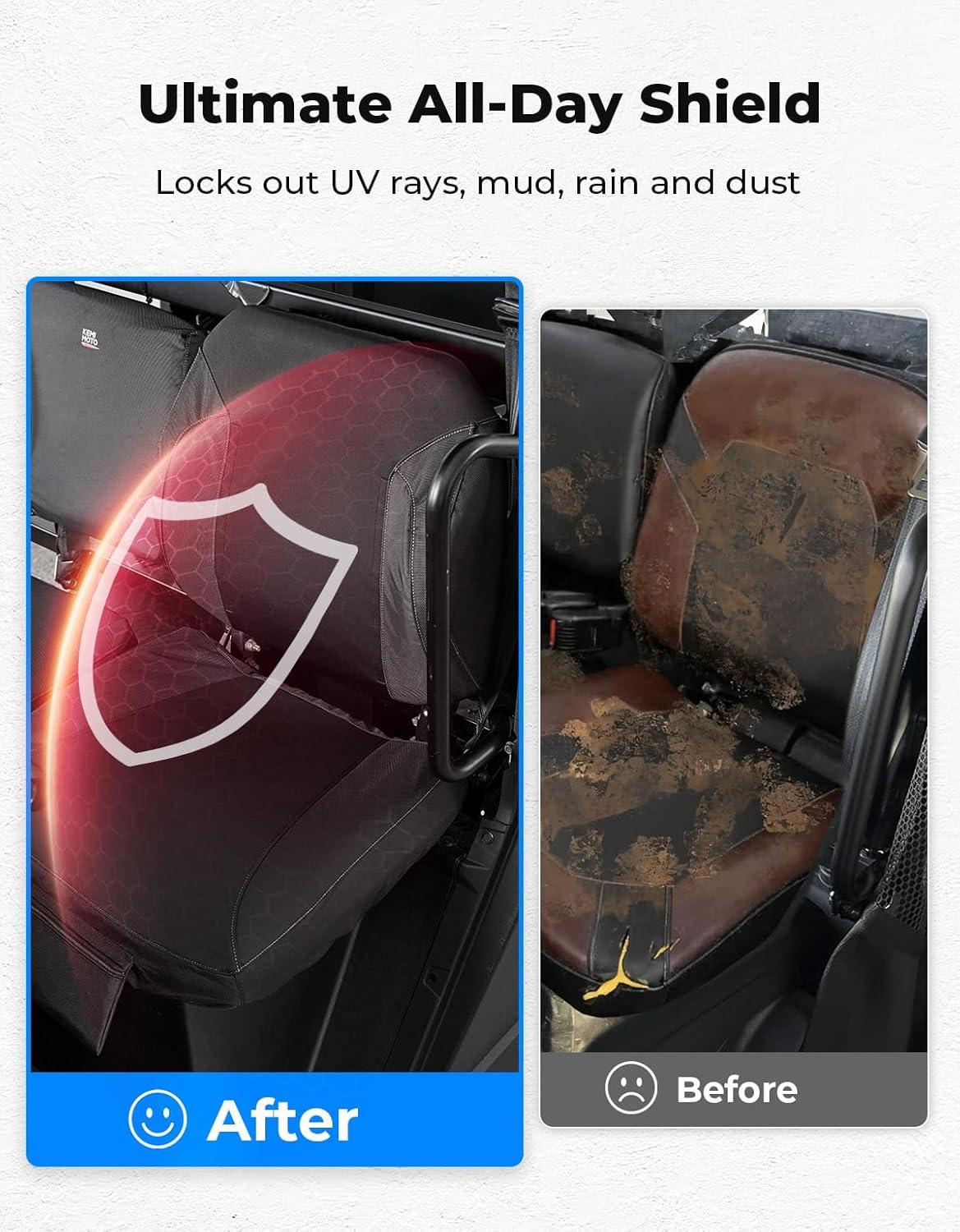 Protect Your Seat: KEMIMOTO UTV seat covers are made of Neoprene and 1680D Oxford cloth with high scratch resistance. Its wear- and tear-resistant characteristics mean you no longer have to worry about your seat being hurt by your beloved dog's sharp claws when you travel. KEMIMOTO seat covers can also make your worn seat look like new again