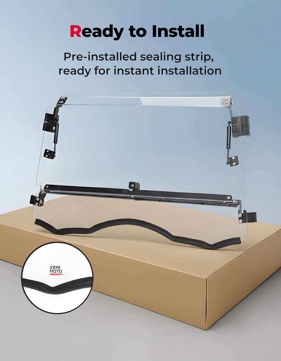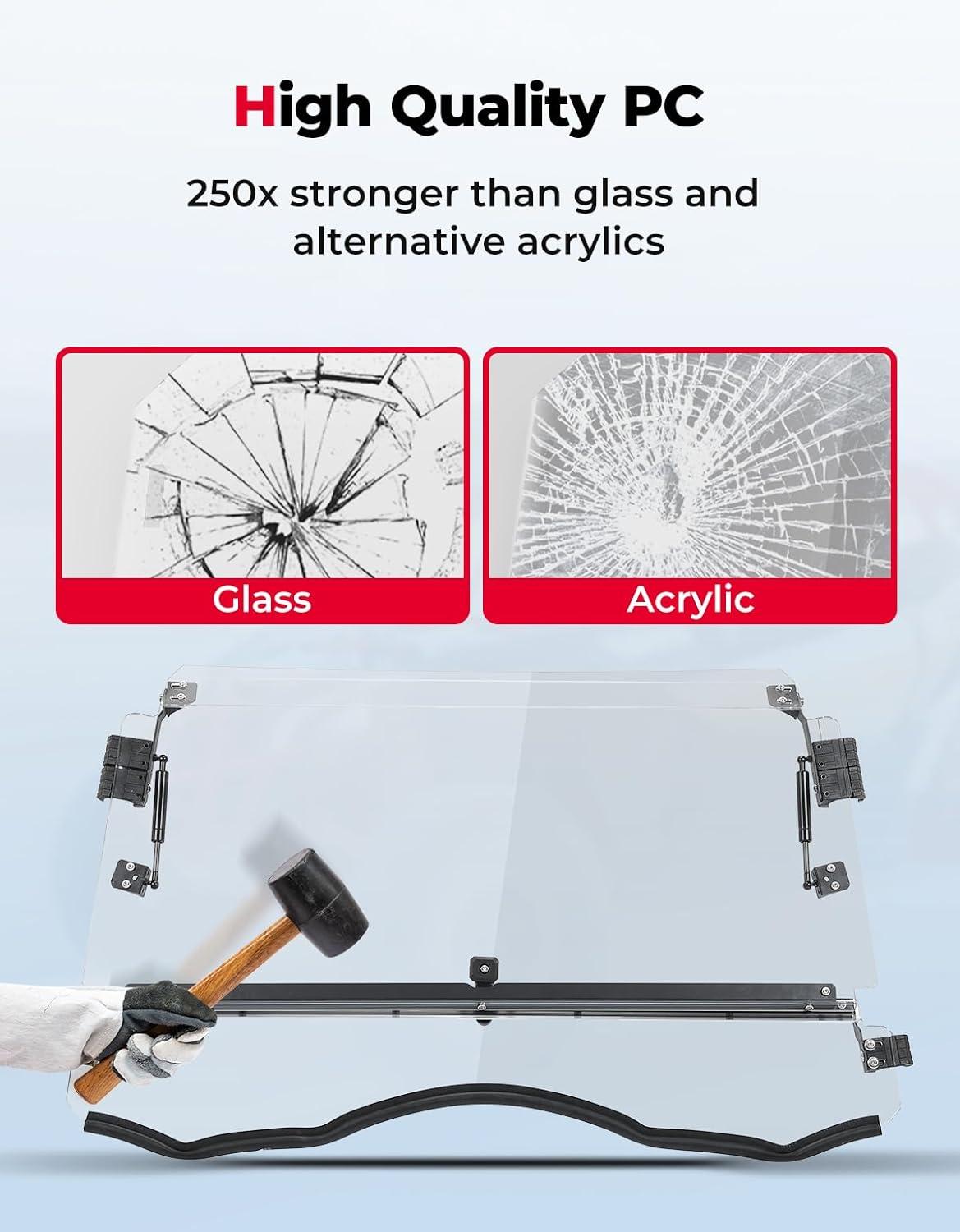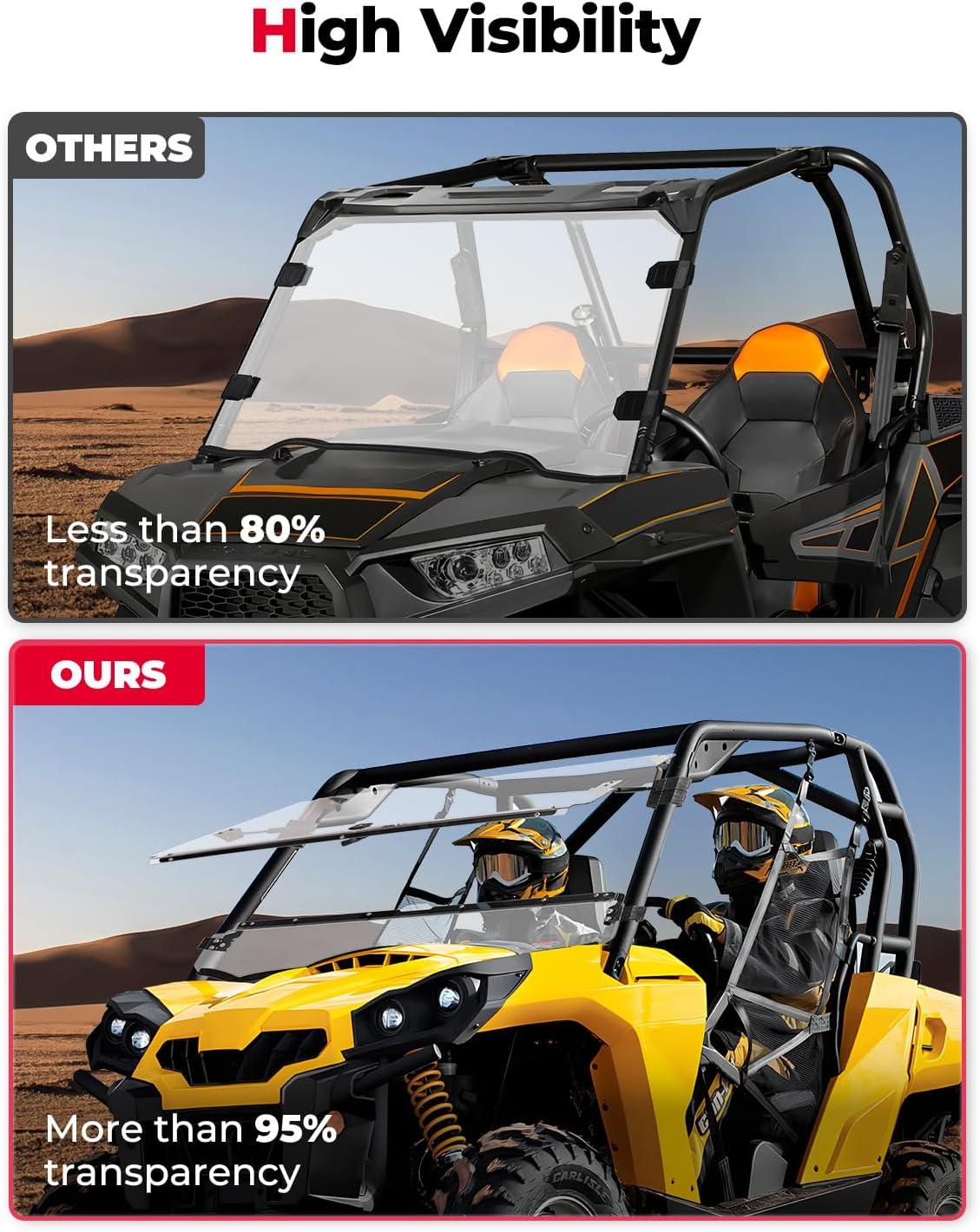 SCRATCH RESISTANCE: KEMIMOTO fold front windsheild is made of double-sided hardened PC material, which makes the windshield more resistant to scratches, impact, wind and sand, and can withstand harsh outdoor conditions