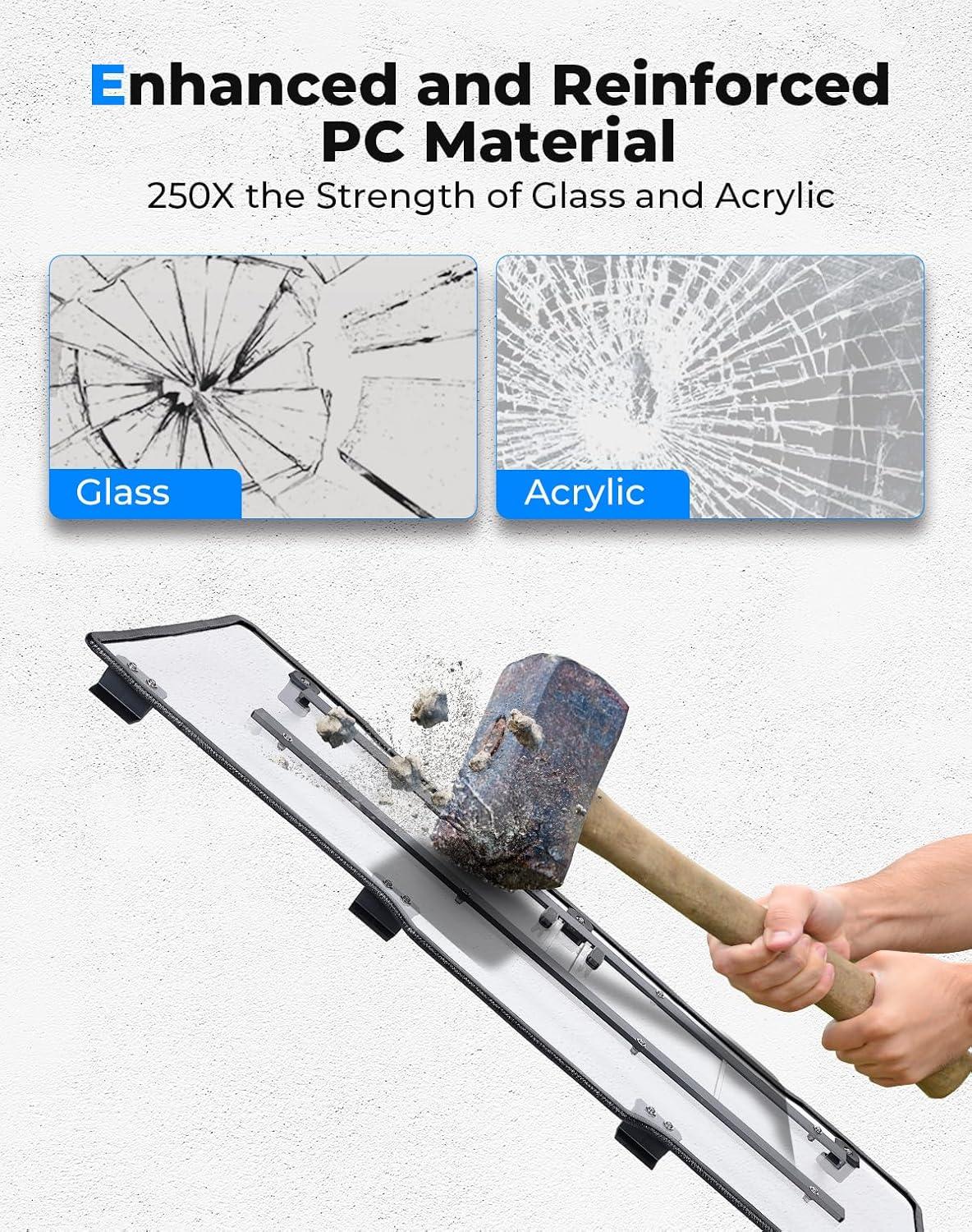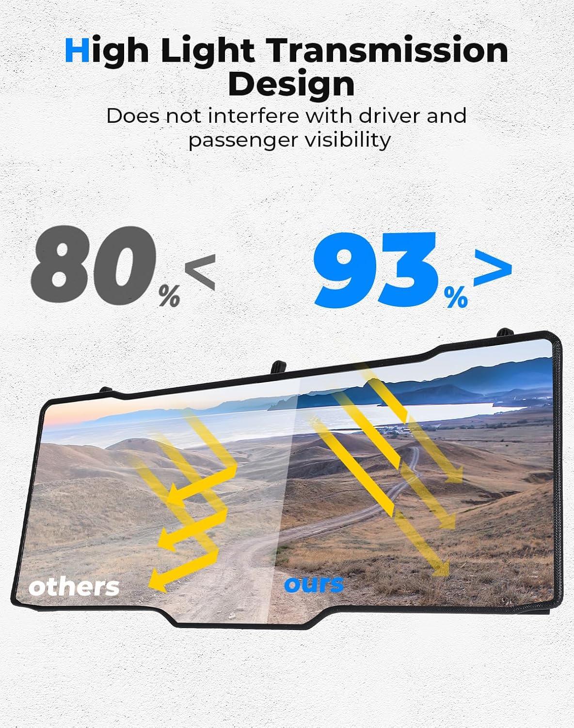 Unbreakable PC Rear Window: Constructed from 3.5″ thick PC material, the rear windshield is resistant to shock, shattering, and corrosion. It is 250 times stronger than glass and 25 times stronger than acrylic. PC rear window ensures good light transmission without interfering with the use of the center mirror and helps to attenuate UV radiation
