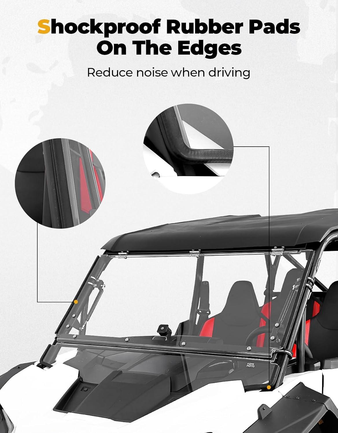 Robust Construction: Crafted from 1/4″ polycarbonate, this flip-up windshield is exceptionally strong—300X more robust than glass. It also includes anti-vibration rubber pads at the bottom, ensuring a snug fit for your UTV and protection during rough rides
