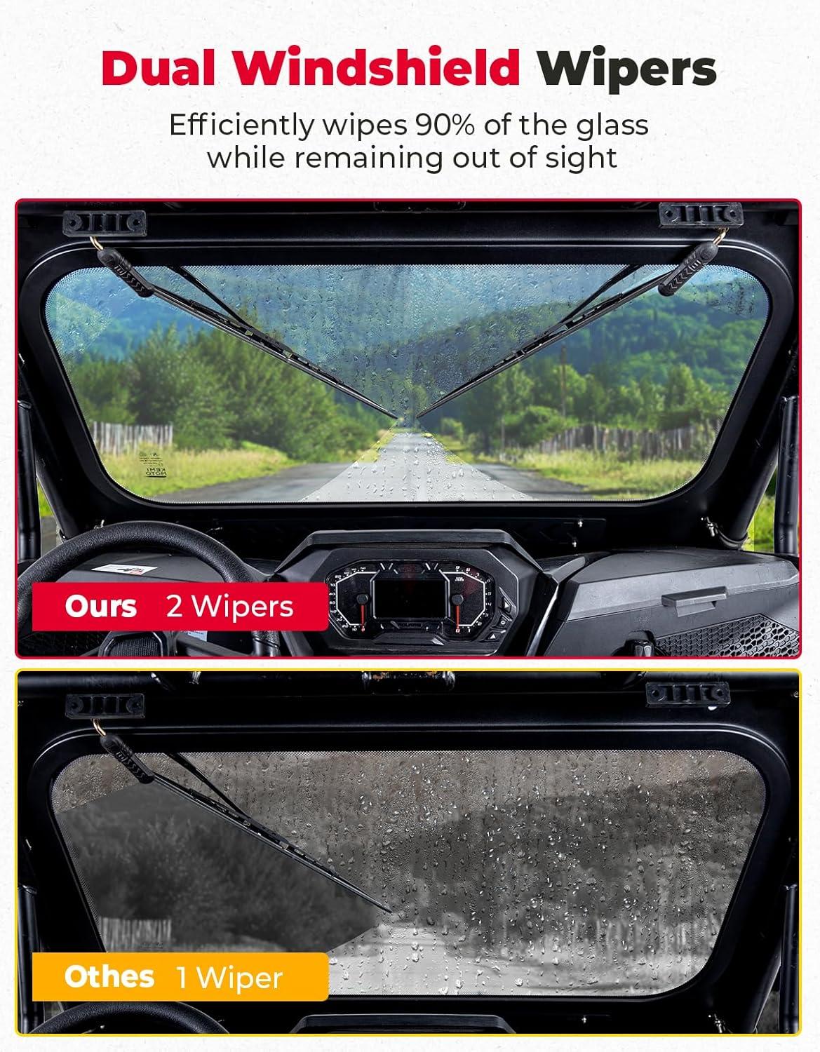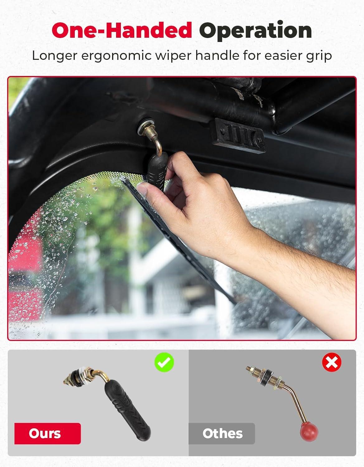 2 Windshield Wipers: The KEMIMOTO windshield is equipped with 2 wipers and features a longer handle design, allowing you to quickly clear water droplets or debris from the windshield with one-hand operation. The dual wipers can cover over 90% of the glass, while single wipers on the market only cover 50%