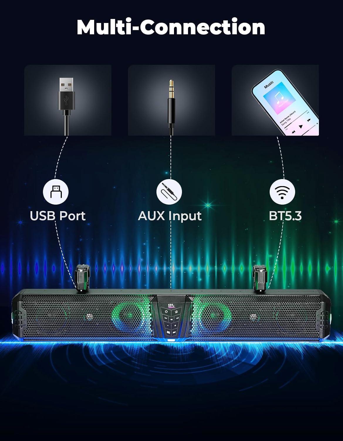 Next-Level Control for Your Soundbar: Music, Volume, Lights, and Power – All in One App. Experience effortless BT5.3 pairing and reconnection, compatible with smartphones, MP3 players, tablets, computers, and more. The KEMIMOTO UTV Sound Bar also boasts USB input/output ports for flexible power delivery and device connectivity, plus a dedicated Party Mode that lets you link two speakers simultaneously—expanding sound coverage and elevating the atmosphere with vibrant, immersive audio