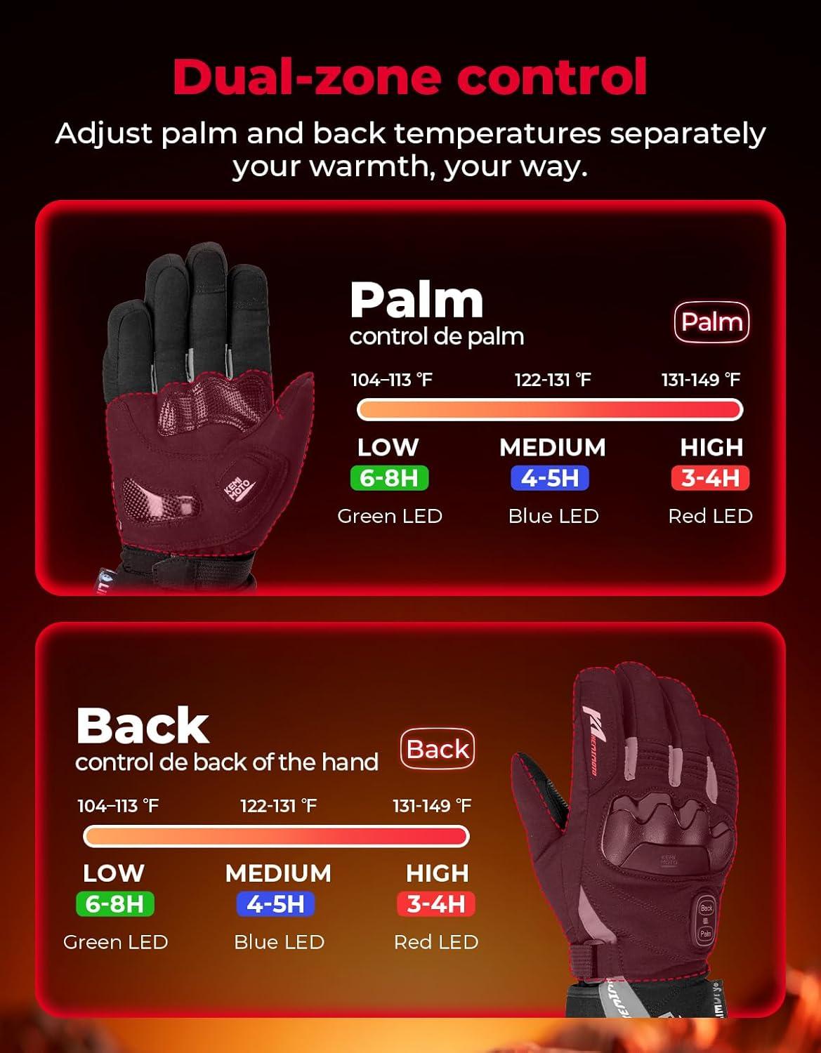 KEMIMOTO ALL-PURPOSE HEATED GLOVES: No More Wet Hands! These gloves feature advanced LIMDRY technology for superior waterproof and windproof protection. The splash-resistant exterior and internal layer block cold water and wind. A silicone shell protects your knuckles, while PVC leather adds durability and grip. Ideal for skiing, motorcycle riding, hunting, ice fishing, sledding, and snow shoveling. It also makes a thoughtful and comfortable Christmas gift for both men and women