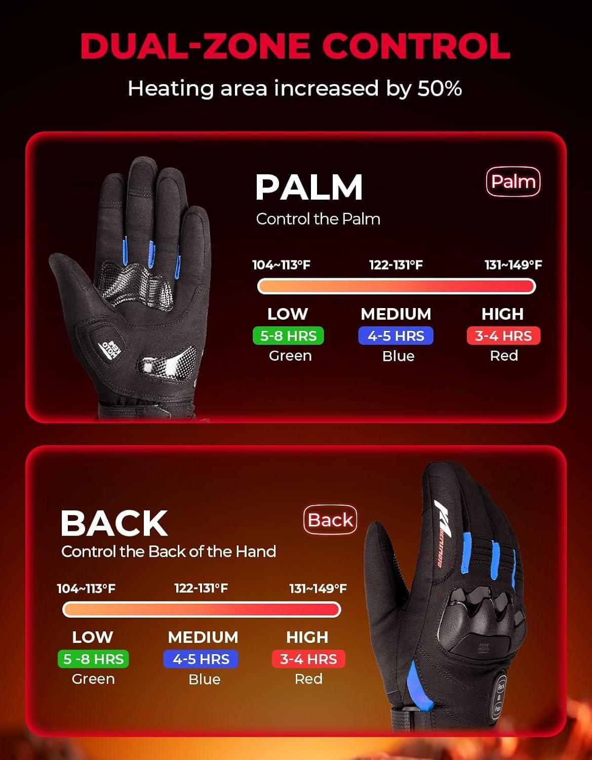 WRAP-AROUND HEATING:Our motorcycle heated gloves are equipped with composite silk heating elements that provide extensive and uniform heat. The heating wires extend across the entire back of your hand and palm to keep your hands warm and cozy. This design not only enhances comfort but also promotes blood circulation and helps alleviate arthritis symptoms. Put on our heated riding gloves to stay healthy while fully enjoying your ride