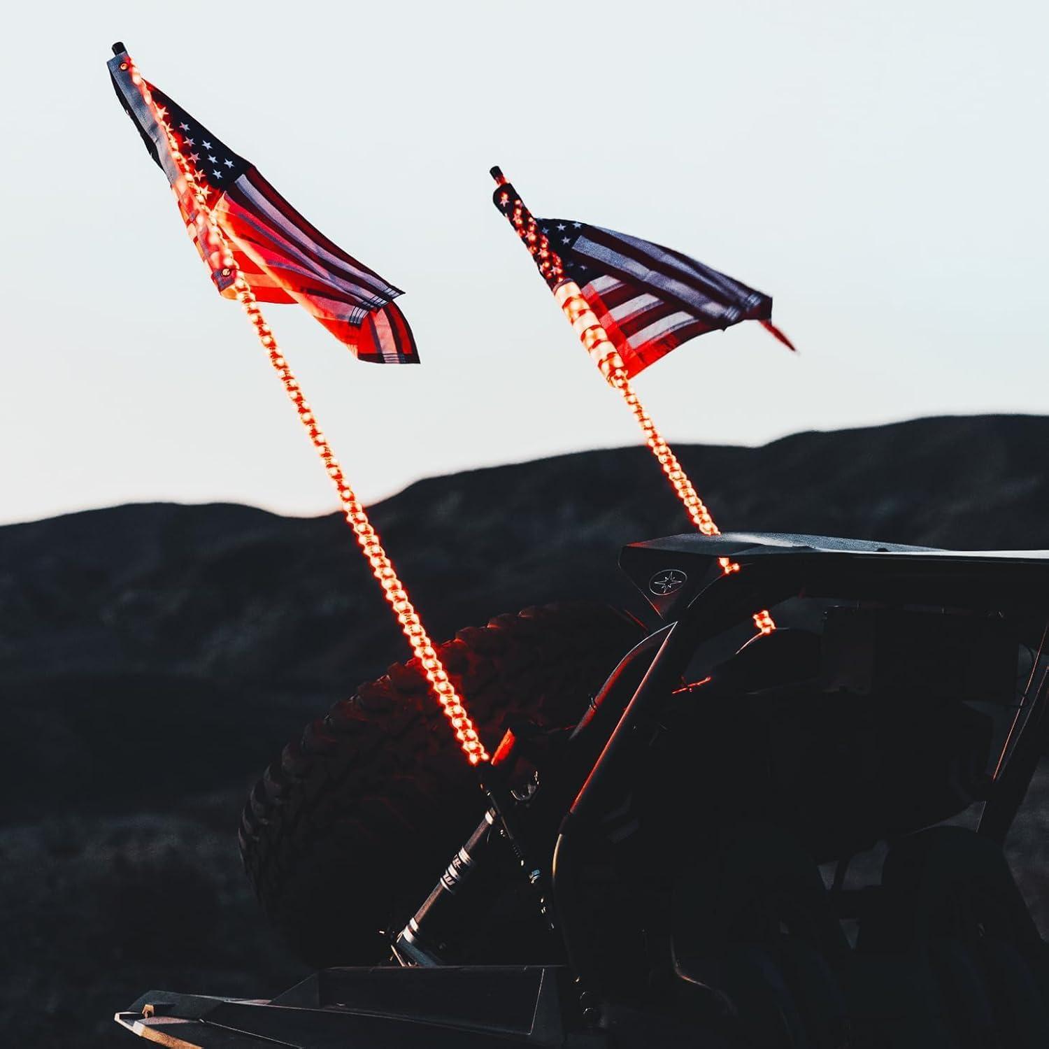 Package Includes: Two 3ft kemimoto whip lights, one RF remote control, two USA flags, flag mounting hardware, and installation instruction