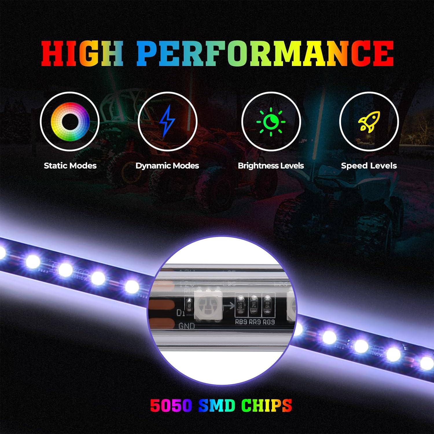 Cool & Safe: KEMIMOTO utv led whips have 22 dynamic modes and 21 static colors Lighting Modes to brighten the whole sky, which will help you stand out from the group, let them notice where you are, especially on the dune hill, track, or trail. More functions for you to discover, such as timing function, scene modes
