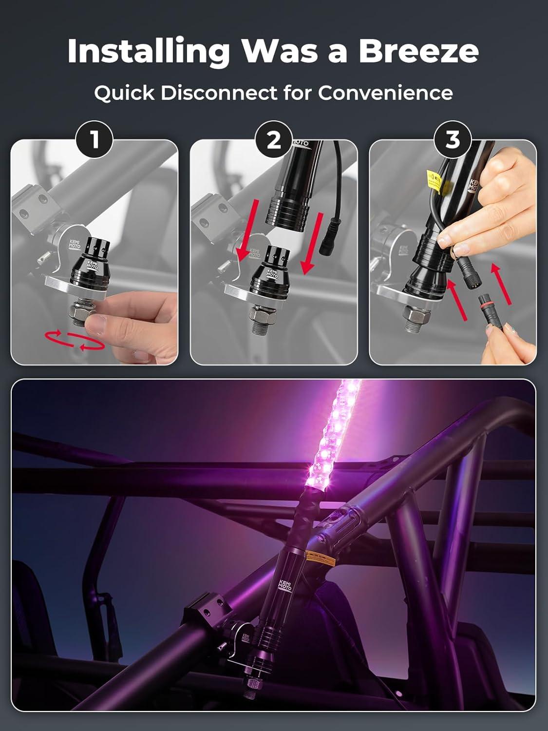 Installation Tips: LED light whip for side-by-side has a quick-release mounting base for easy to install or take off. American Flags with adjustable mounting clamps to prevent the flag from entangling, let the flag wave in the wind on whip light flag pole. The aluminum base is 12mm dia (fits most whip mounts). Warm Prompt: Before plugging the whip lights to the connectors, be sure to align the holes (with convex on one end and concave on the other
