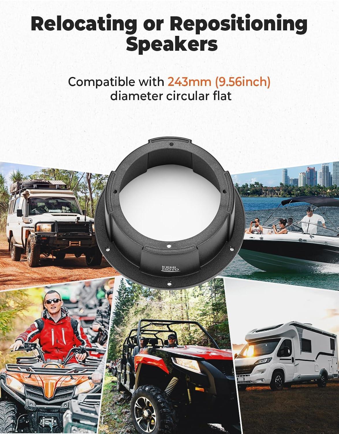 Speakers Retrofitting or Moving: KEMIMOTO utv speaker pods are for speakers retrofitting or moving, you can add new speakers or move existed stereo system to any 9.56inch diameter circular flat surface you want, such as utv roof, dash, door, etc