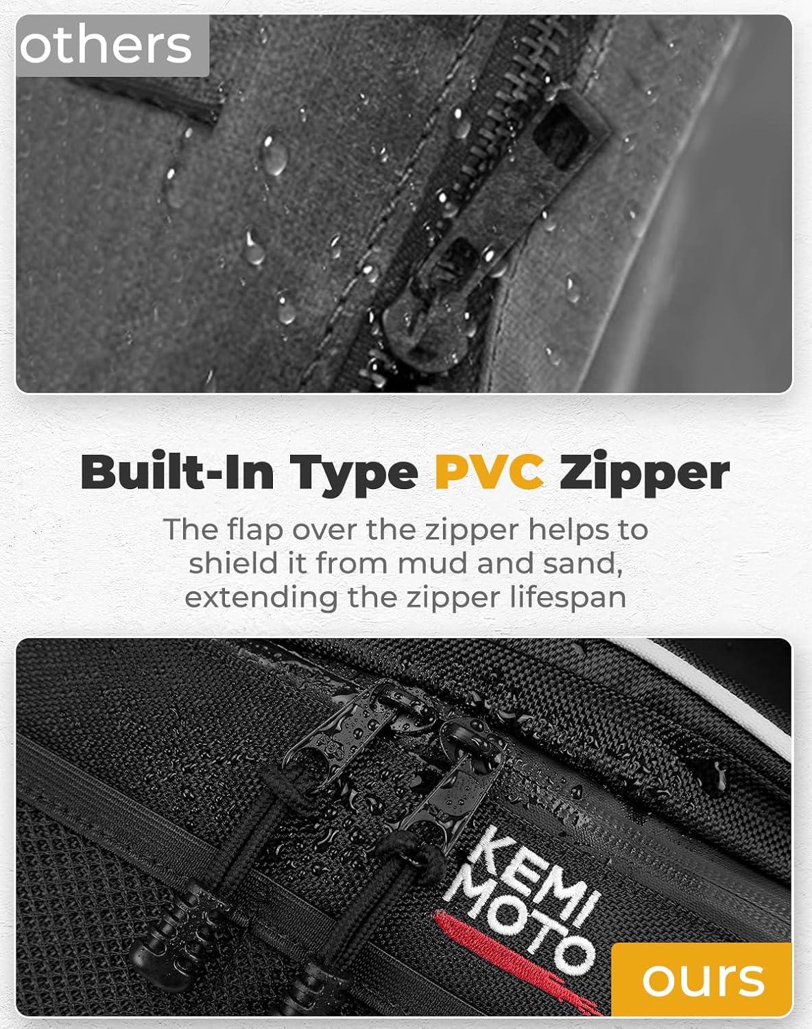 Upgraded PVC zippers:The side door bags equipped with PVC Water-Repellent zippers covered by a layer of fabric to prevent dust or mud accumulation. This ensures that the interior remains dry and clean