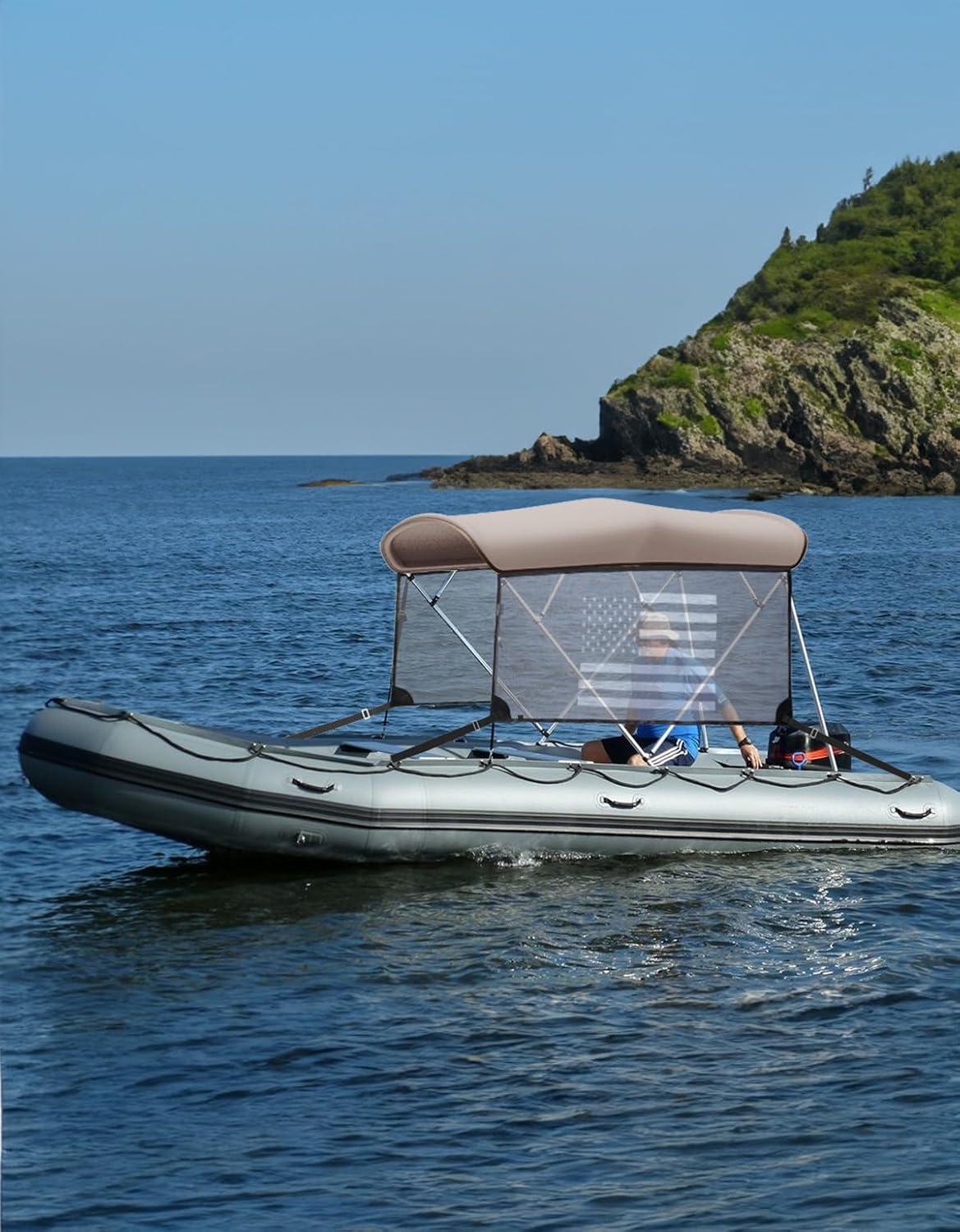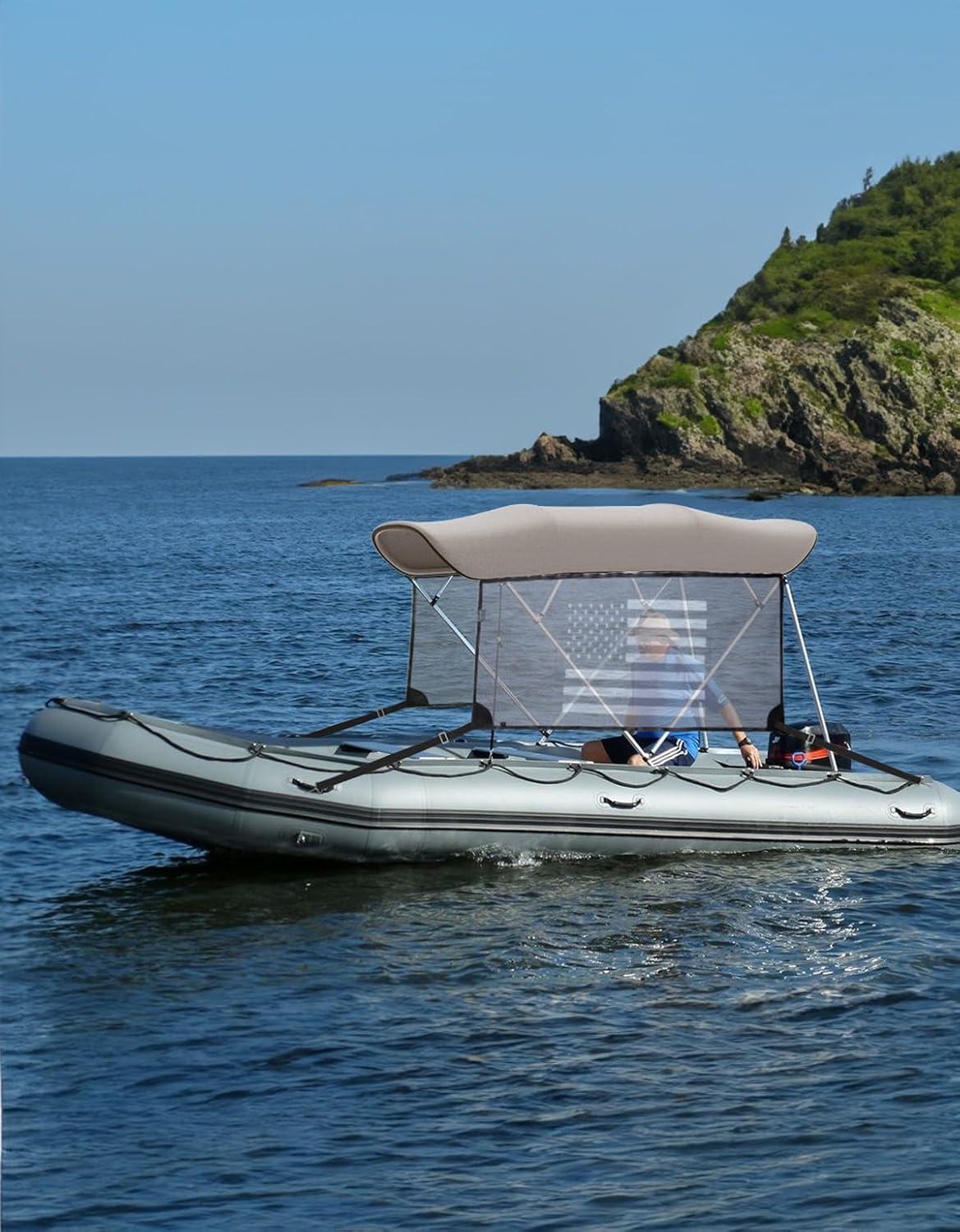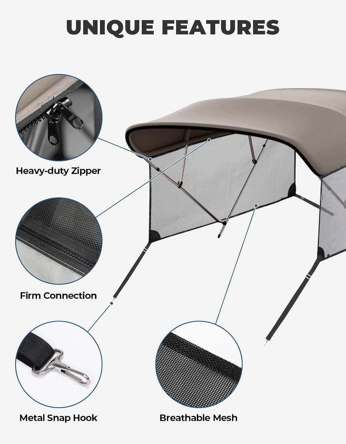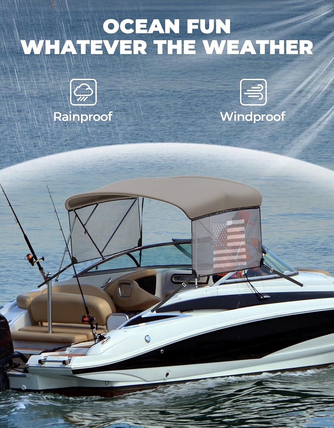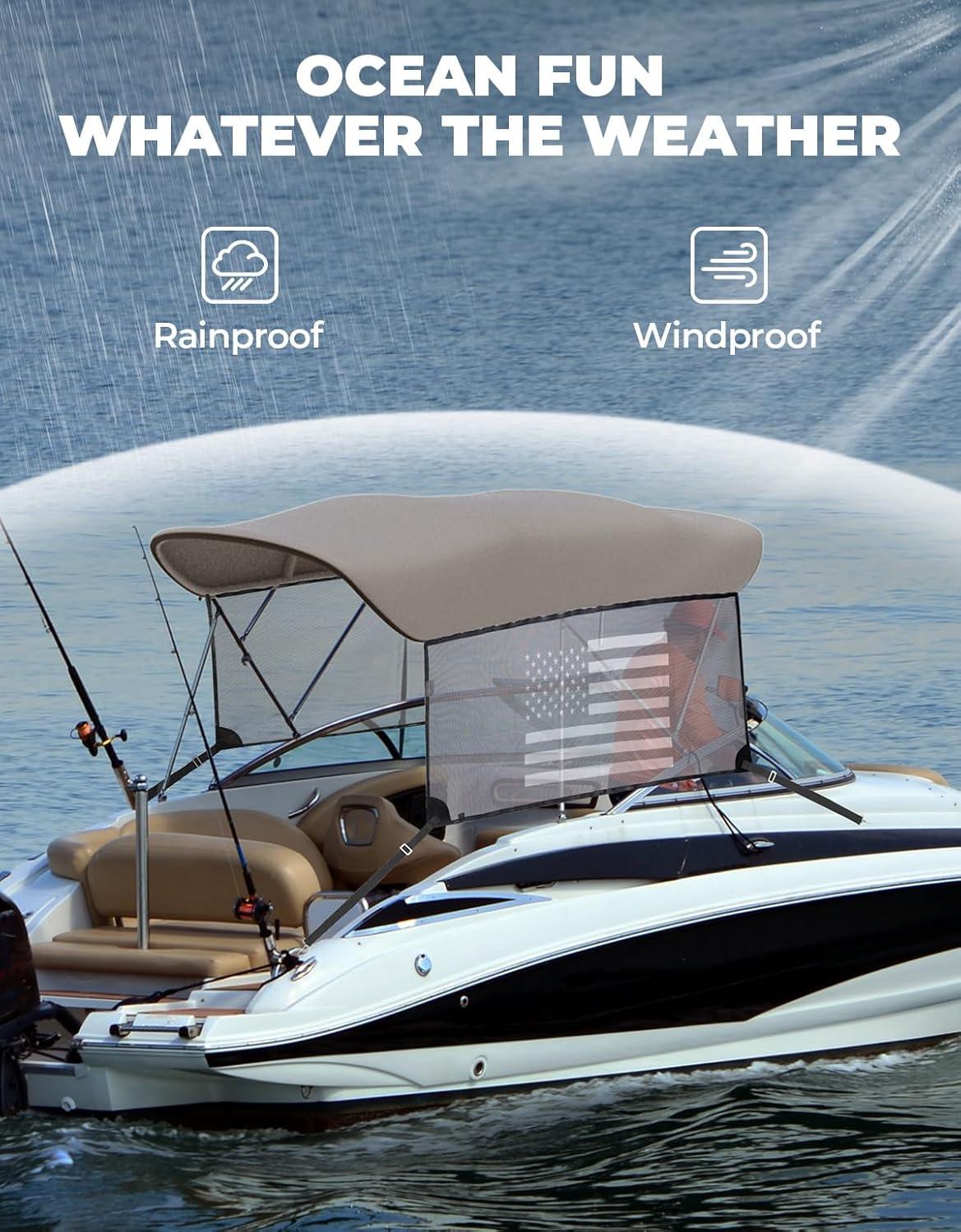 Premium Marine Grade Fabric: Our bimini top is made of durable marine grade 600D polyester canvas and 600D solution dyed fabric, which is waterproof, UV resistant and tear resistant. This ensures that the boat canopy is extremely strong and can withstand adverse weather conditions.