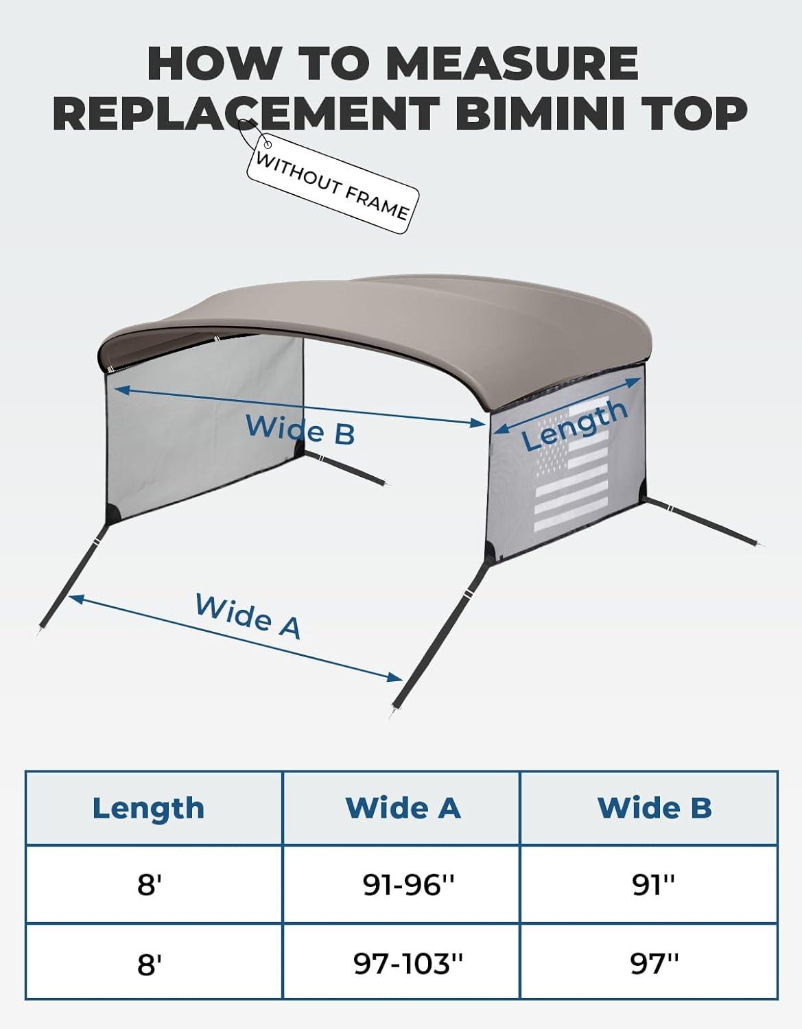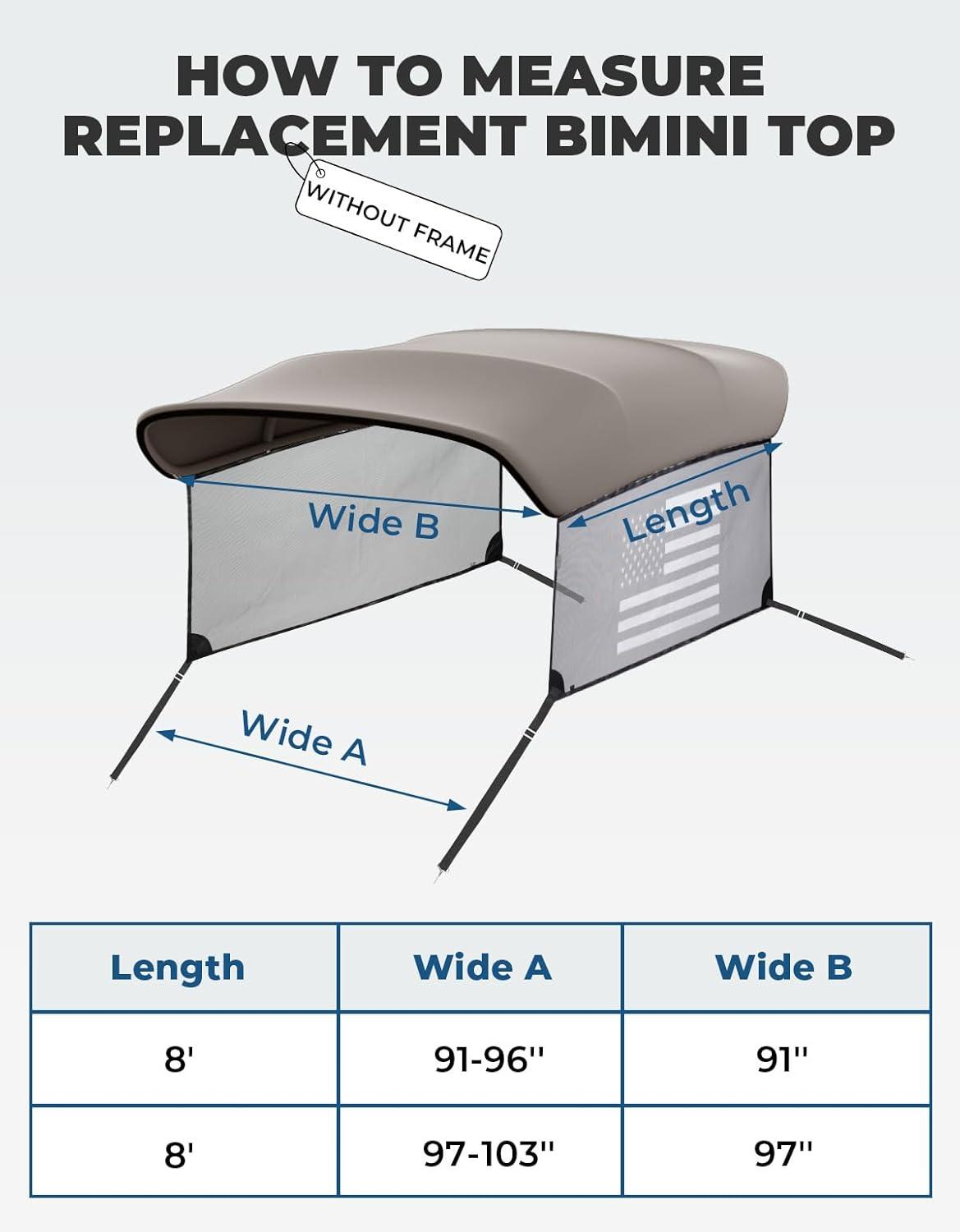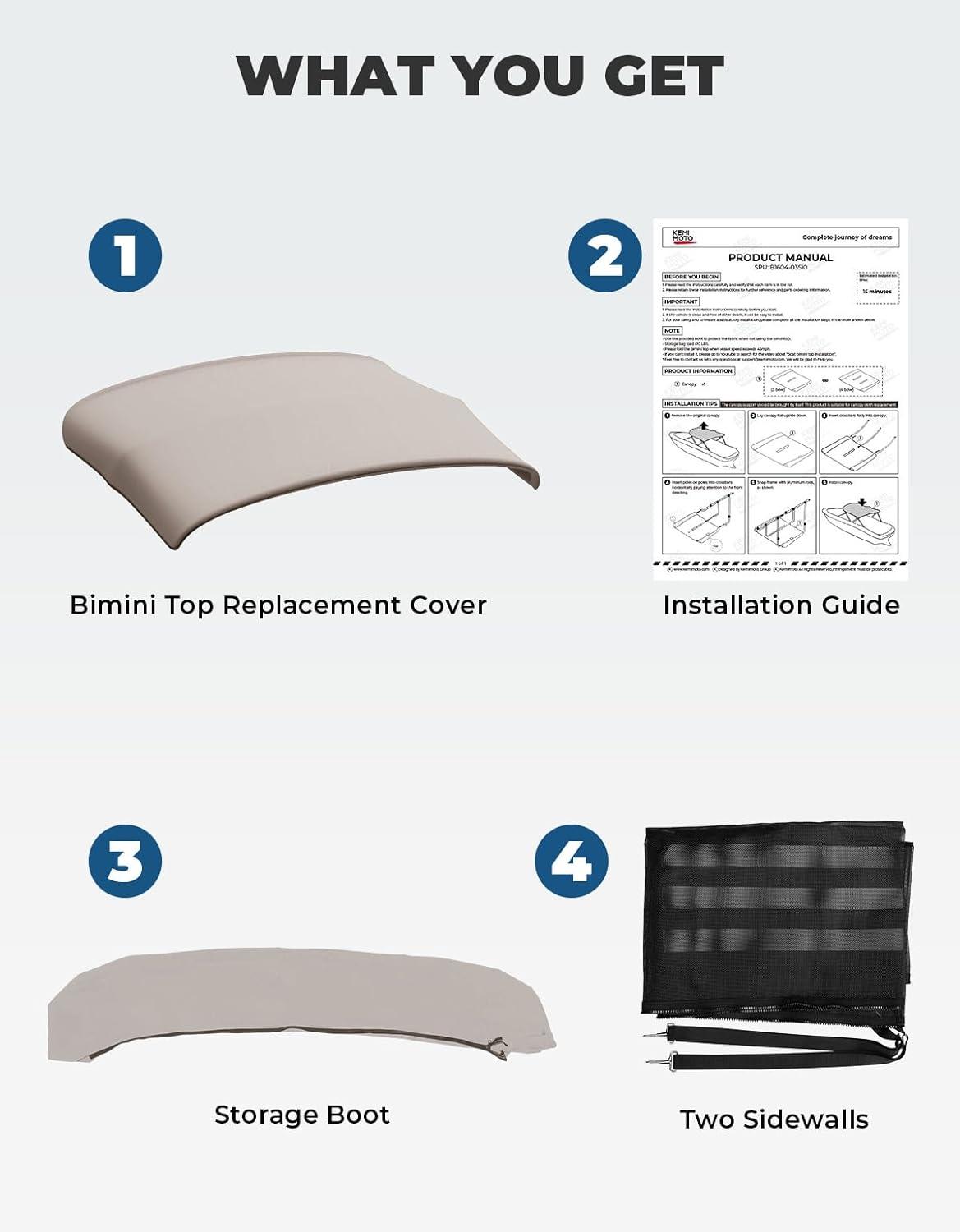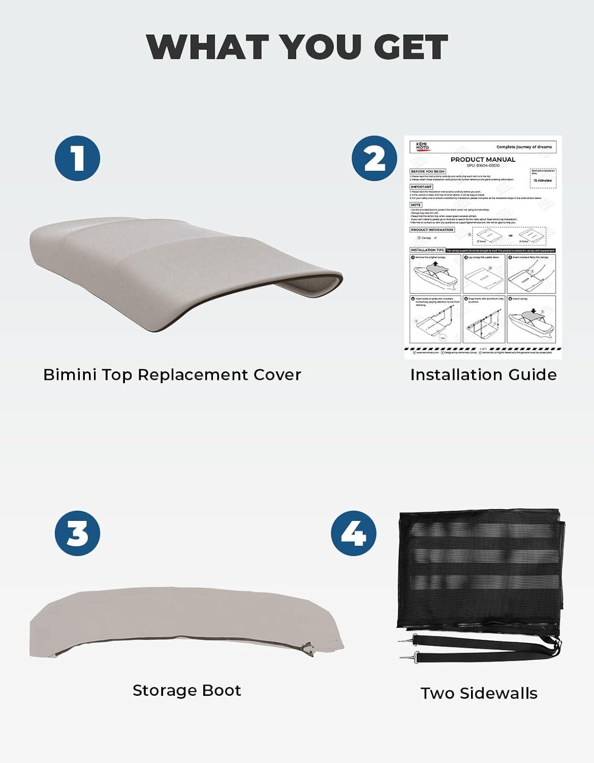 Bimini Top Without Frame: Each product includes a bimini top replacement cover, two mesh sidewalls, storage boot, and instructions. The zippered storage bag allows the bimini top cover to be stored away when not in use. Note that this product does not include Frame.