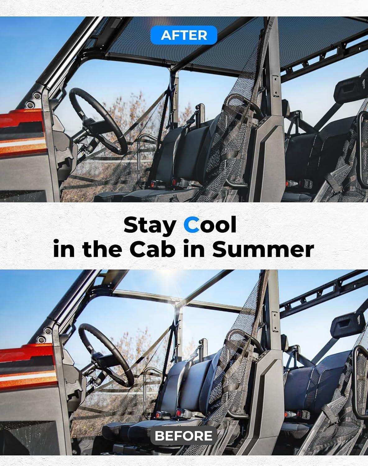 Breathable Airflow & Summer Sunshade: Different from hard top, the utv soft roof offers both sunshade and in-cab airflow, ensuring a cool and comfortable ride for you and your passengers in hot climates or during summer.