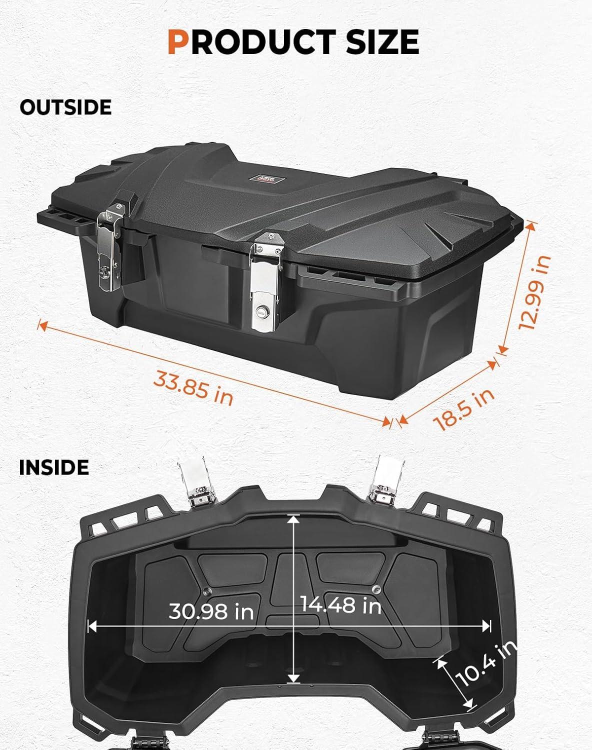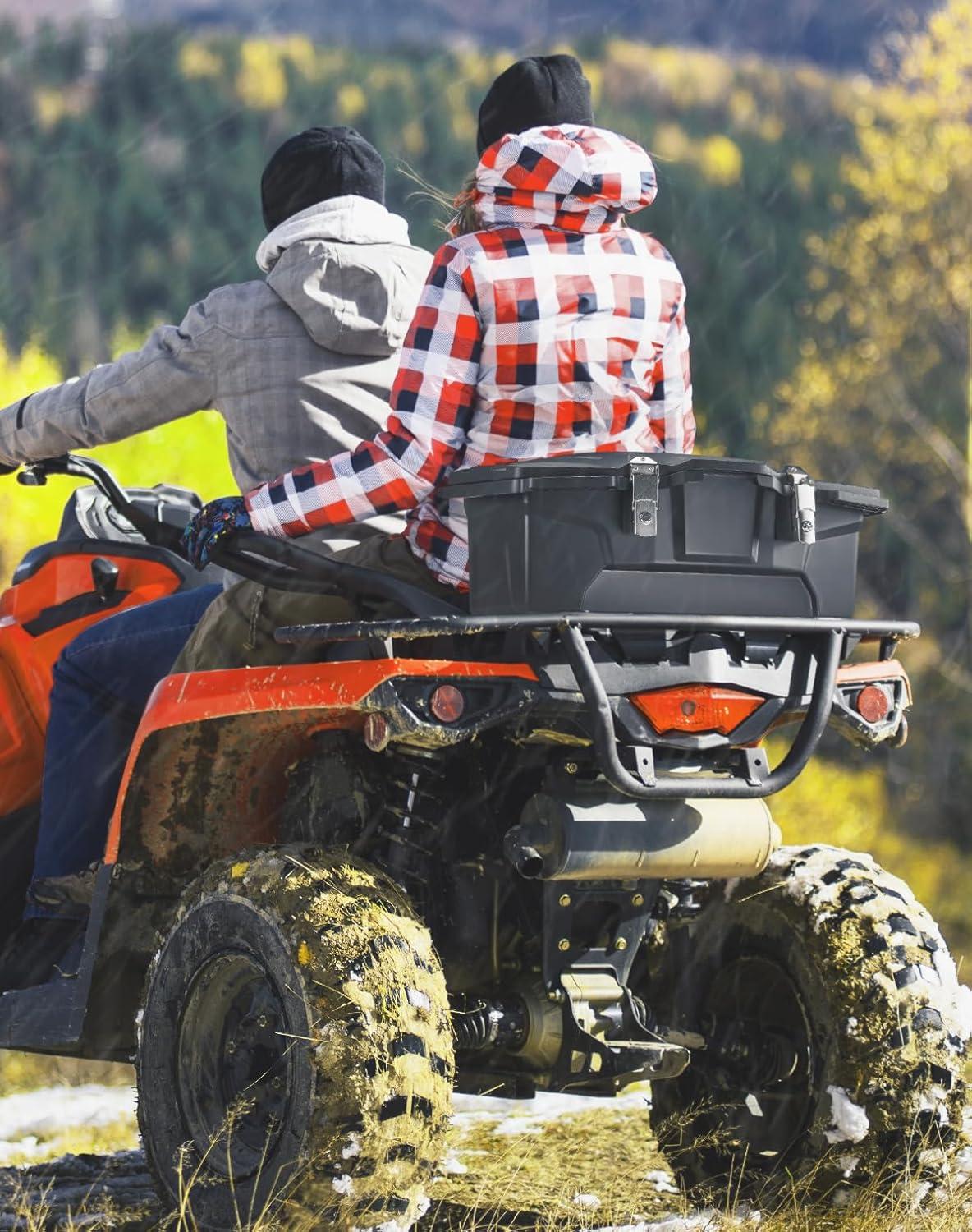 Safe and Comfortable Driving: The contour of the rear cargo box provides a safer experience by minimizing visual obstructions while maneuvering the ATV. The ATV rear box measures 33.85″ x18.5″ x12.99″ IN for unparalleled driving convenience on mountain trails