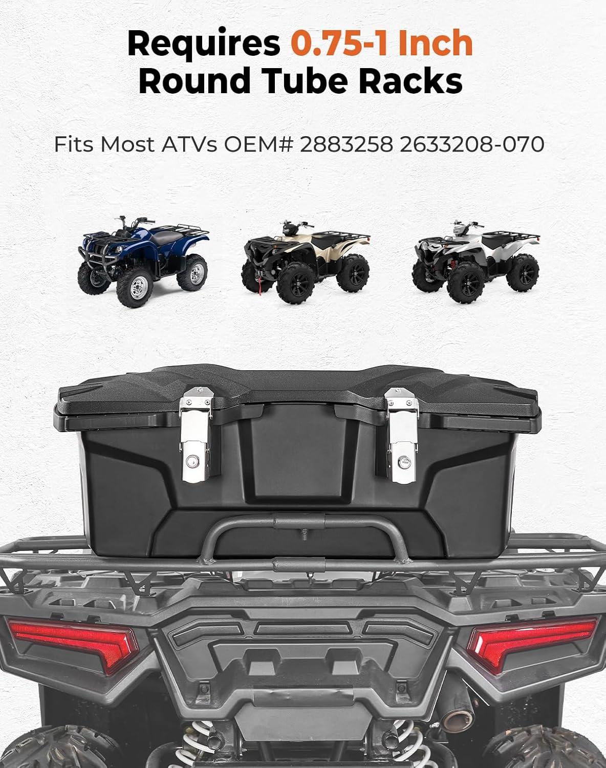 Wide Compatibility: KEMIMOTO ATV Rear Storage Box is universally compatible with most 0.75-1 Inch ATV round tubular racks. Replace OEM# 2883257 2883258 2633208-070. Compatible with CFMOTO Cforce 450, Sportsman 1000, Grizzly 660, Kodiak Grizzly 700 Grizzly 90 etc. Compatible with Kawasaki Rancher Brute Force Grizzly Most ATV. PLEASE NOTE: Not Compatible with Square Tube Racks. Not Compatible with Vehicles with Rear seat with backrest