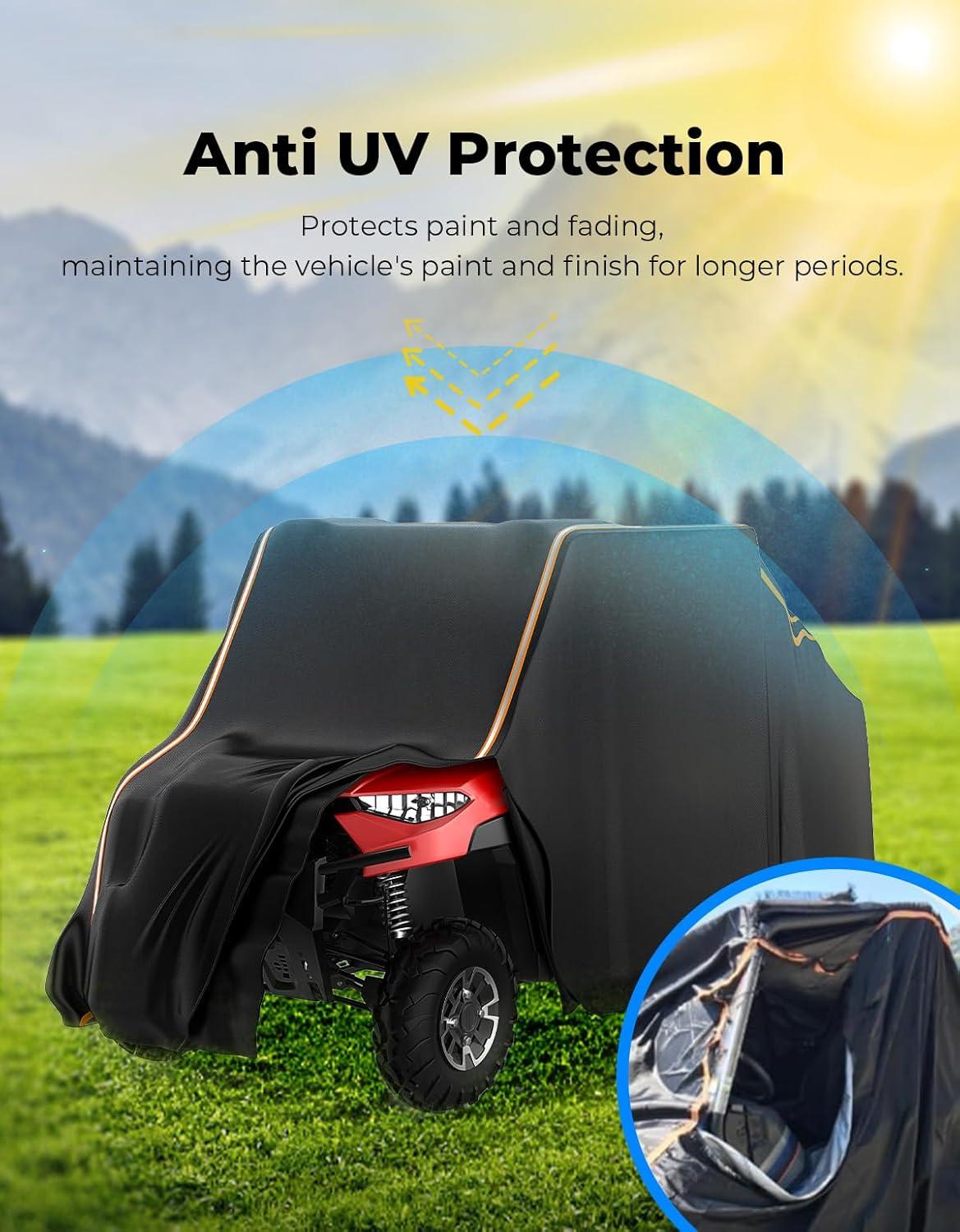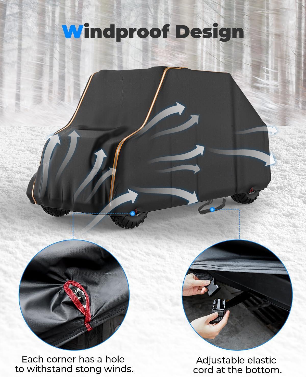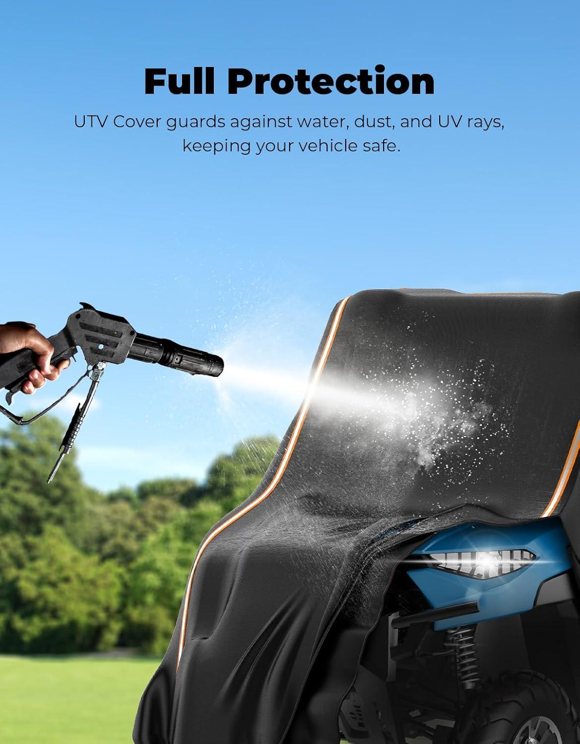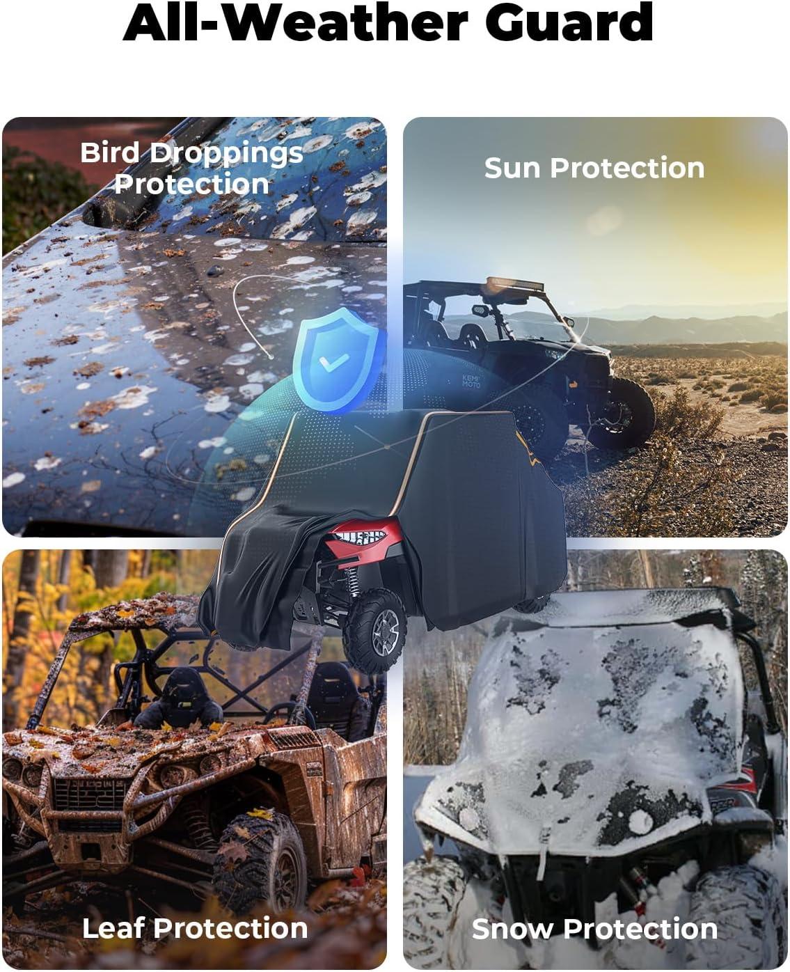 Rain and Snow Resistance: Nothing is more frustrating than having to clean your machine every time you use it. KEMIMOTO cover keeps your UTV clean from rain, snow, dust, leaves, debris, and harmful UV rays