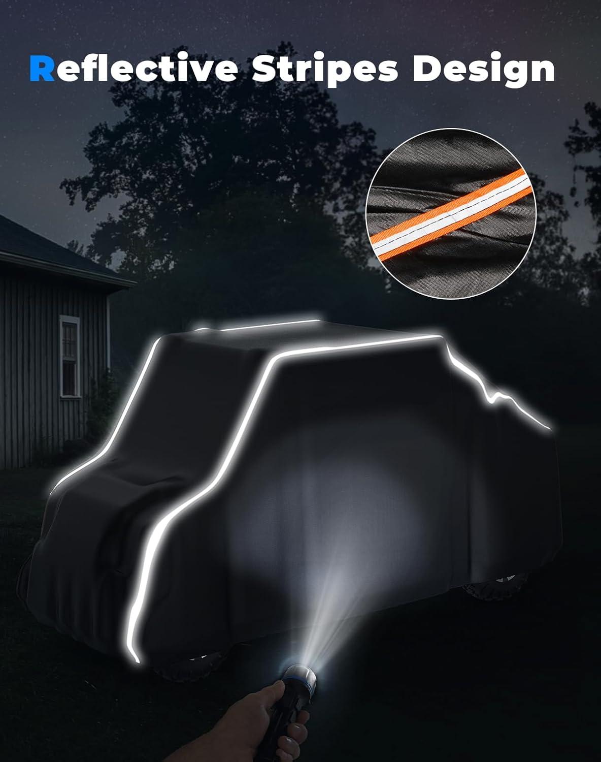 Reflective Strips: This waterproof UTV cover has 2 reflective strips on both sides, which can help others perceive UTV in poor light conditions by a light source and can serve as a warning to avoid being hit by other vehicles at night