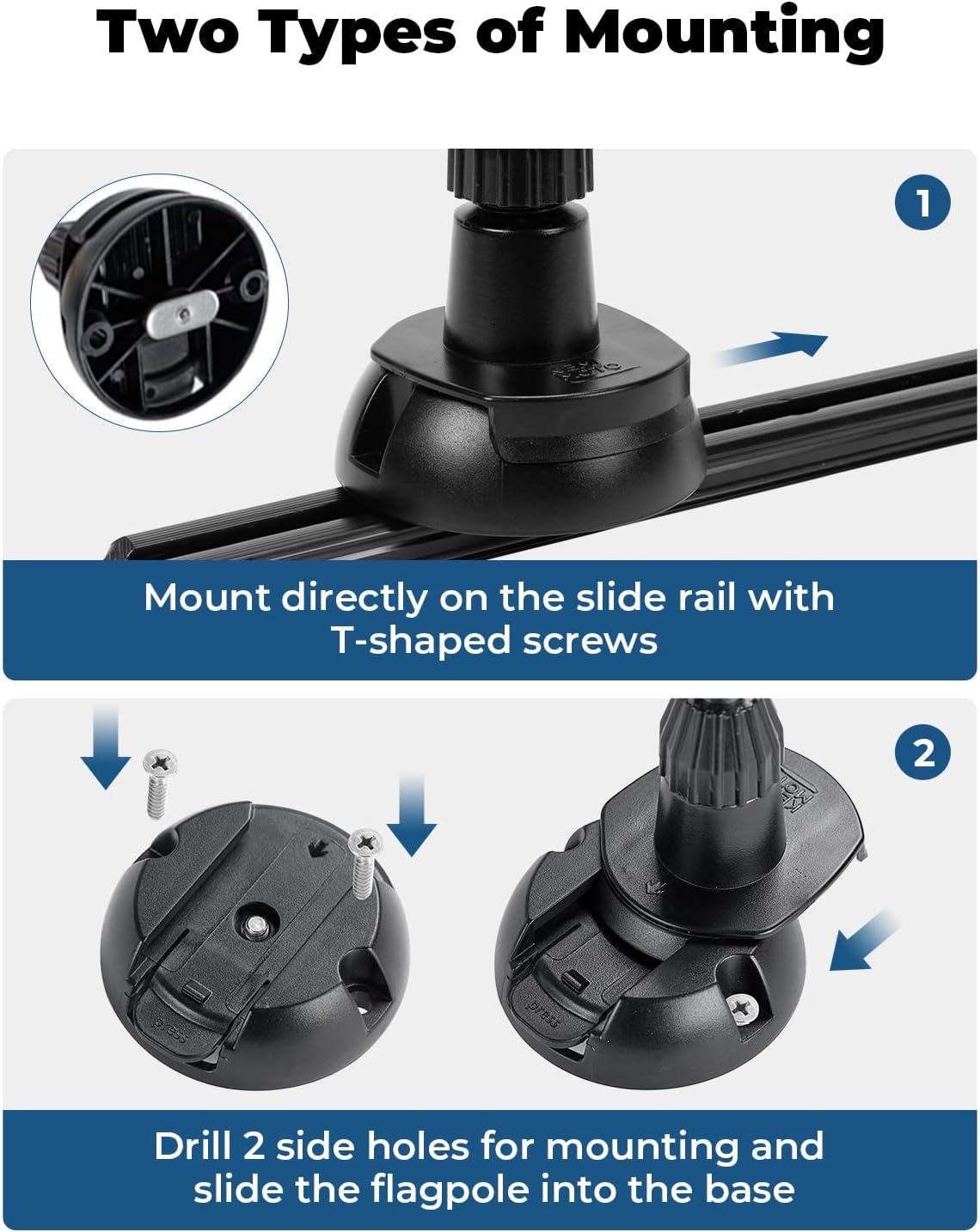 【Two Mounting Types】Our kayak flag with pole can be easily installed on kayak tracks using T-screws located under the base. If the kayak doesn't have tracks or they are not compatible, the base can be drilled and screwed directly onto the kayak to provide customers with a wider range of applications.