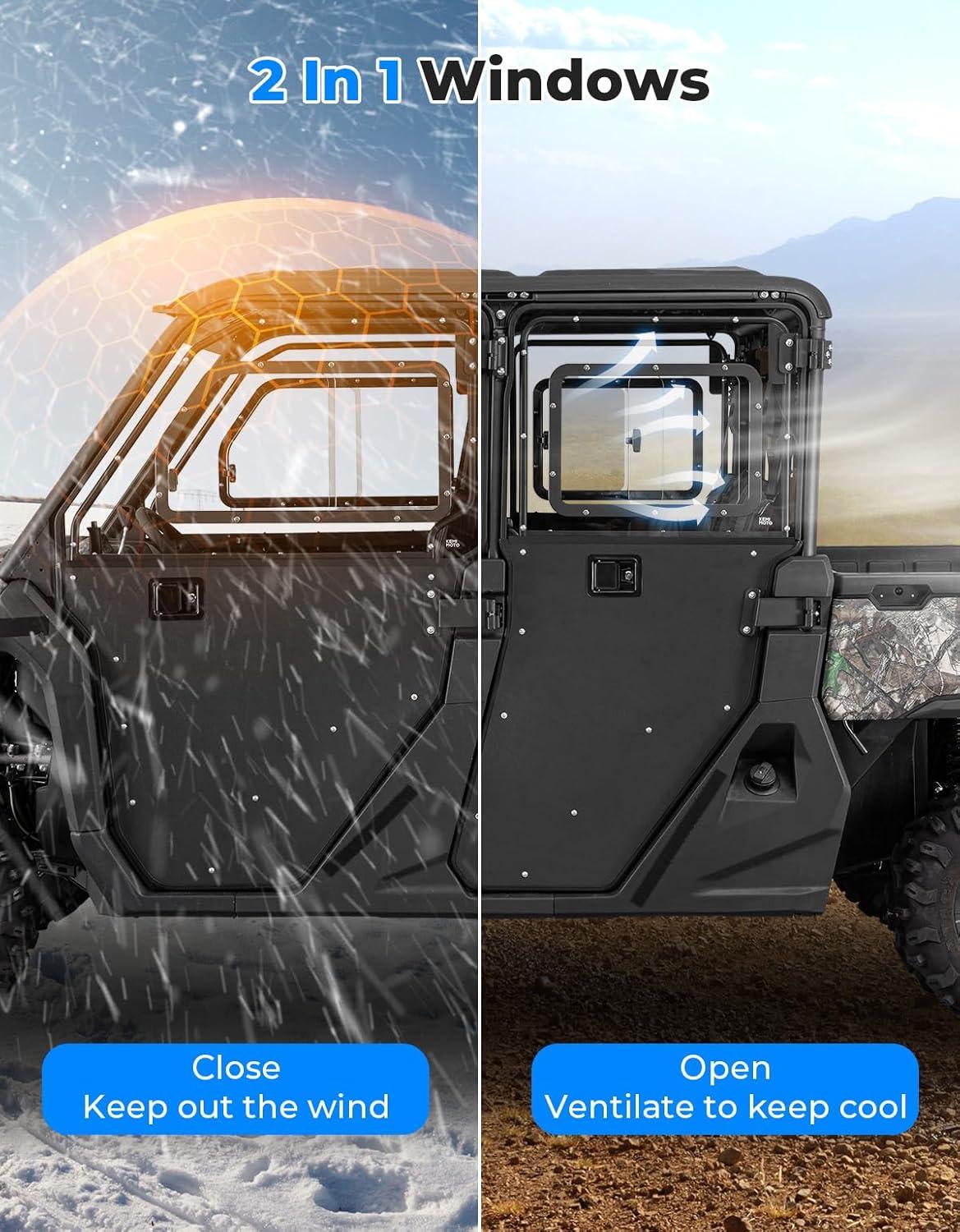 2 in 1 Design for Year-round Riding: All four doors have sliding windows that open for ventilation to cool down and close to block cold wind while retaining warmth