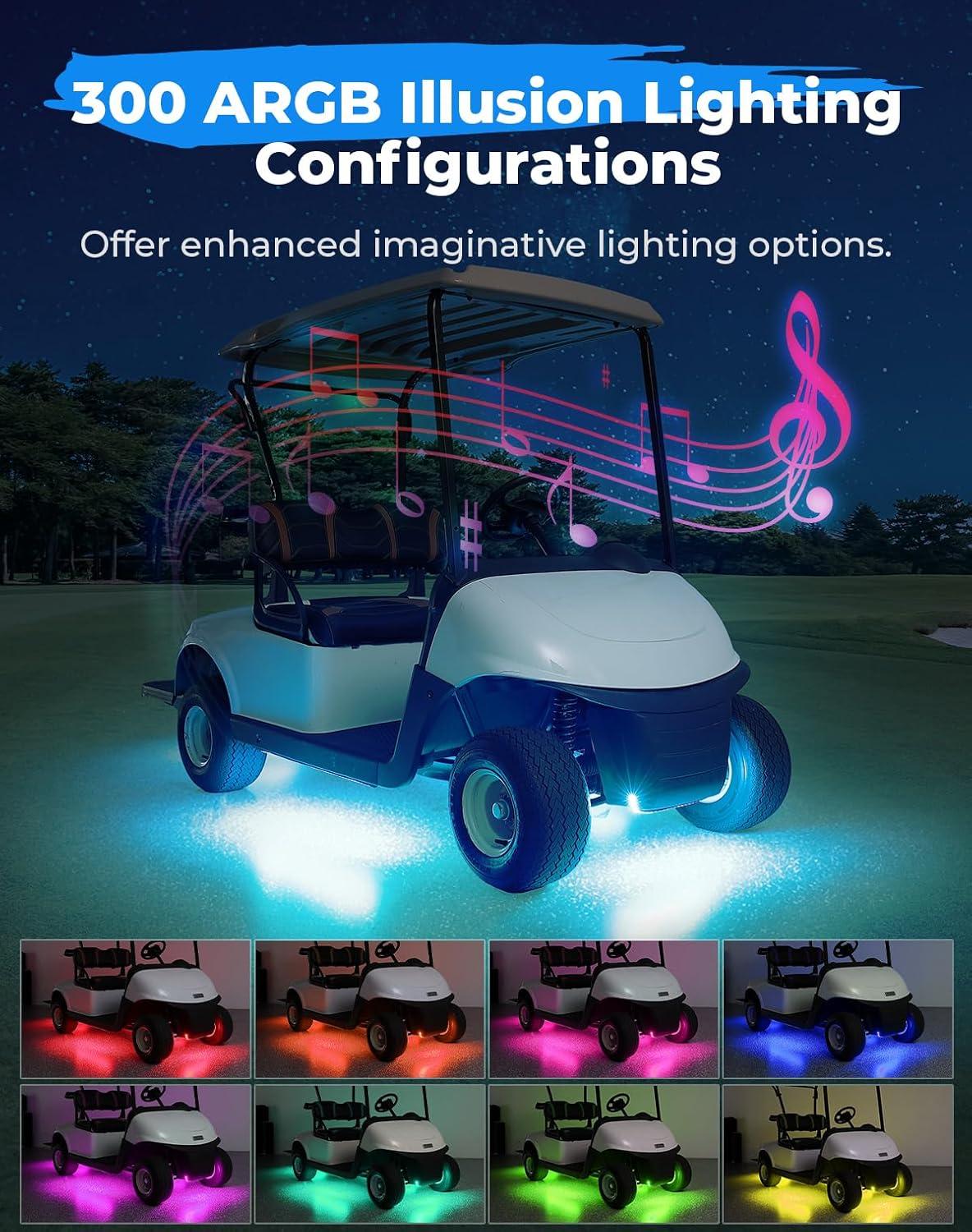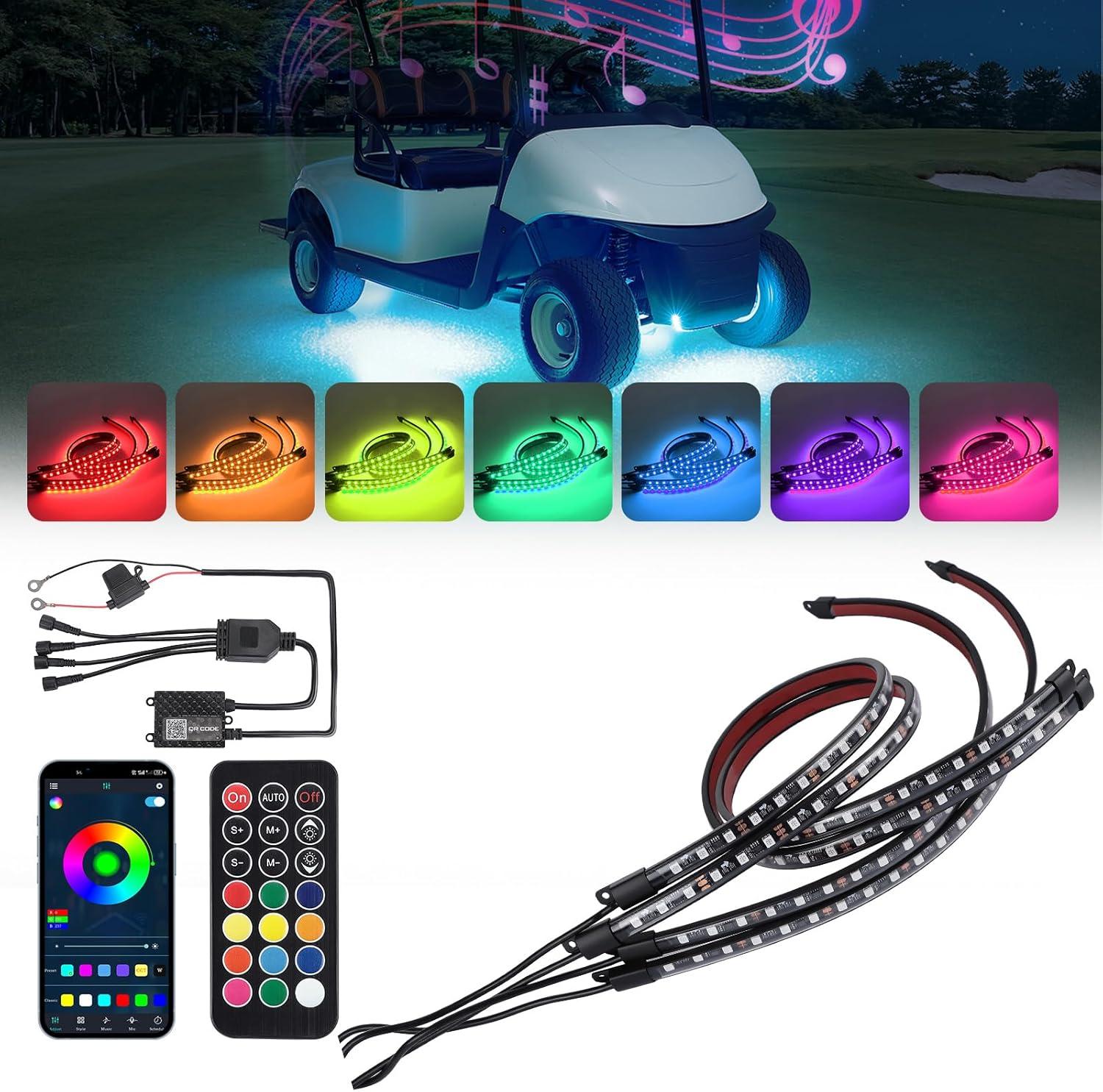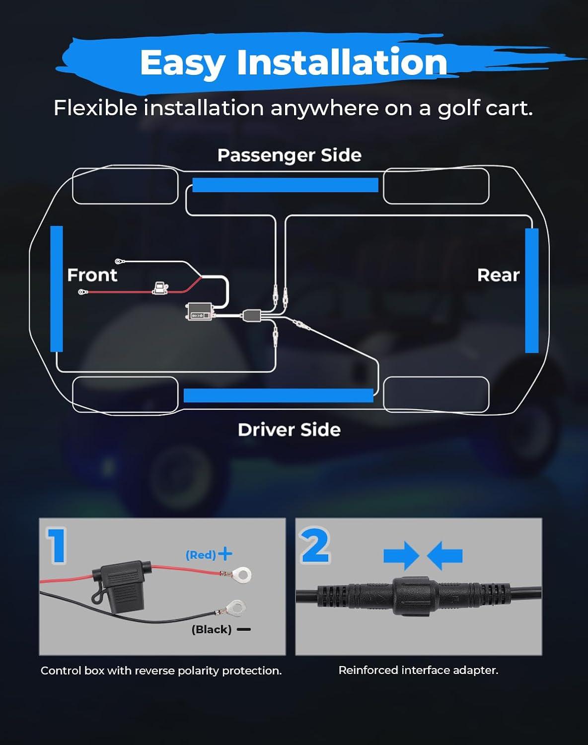 Universal Fit for 12V Golf Carts: KEMIMOTO 4PCS Golf Cart Underglow LED Strip is universally compatible with Club Car, EZGO RXV, TXT, Drive2, ICON, and Kandi. All mounting accessories are provided for quick installation without complicated wiring or modifications