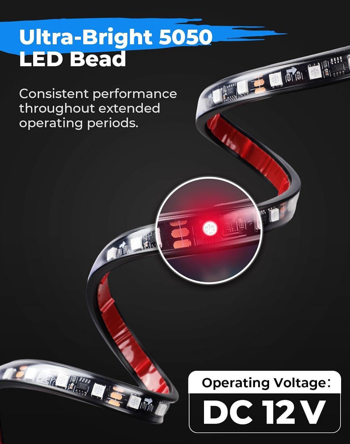 Multi-Security Protection: Equipped with a waterproof and high-temperature resistant control box, this led light strip kit features reverse connection protection to prevent circuit damage. It also comes with a waterproof 4P connector and a cold and high temperature resistant wiring harness for added safety