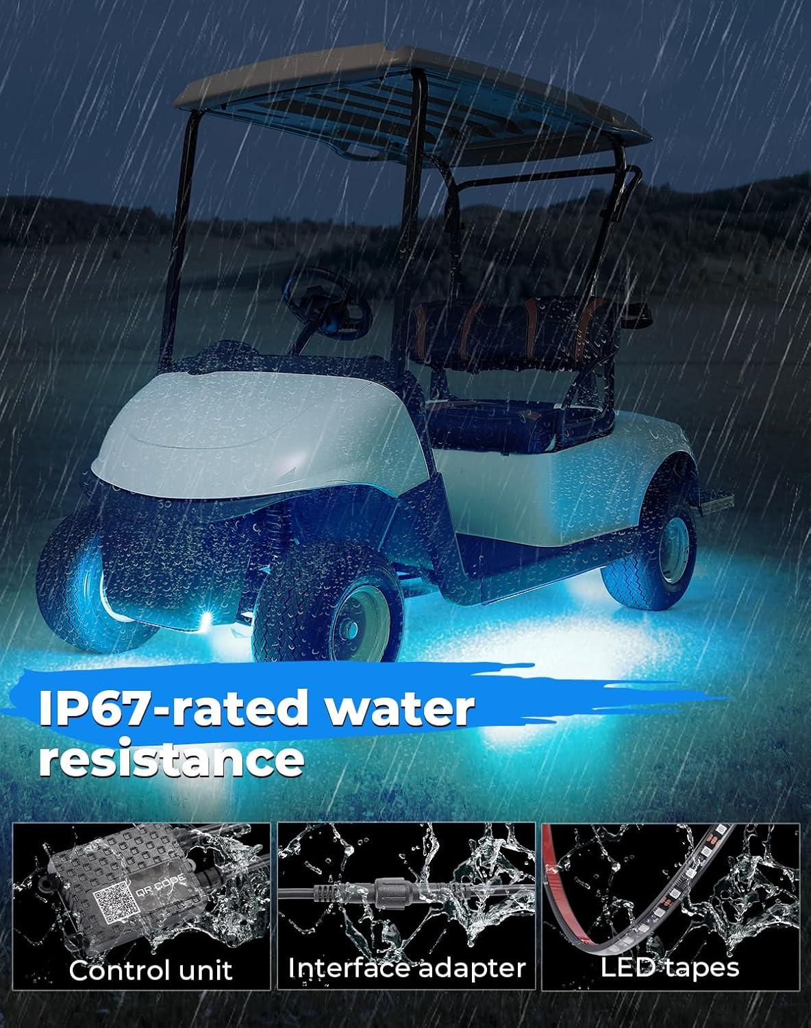 IP67 Waterproof LED Lights: Our KEMIMOTO golf cart underglow LED strips are sealed in a transparent dustproof housing using IP67 waterproof technology. This advanced technology offering full protection and maintaining brightness even in rain