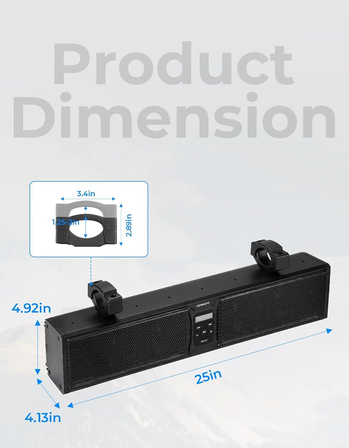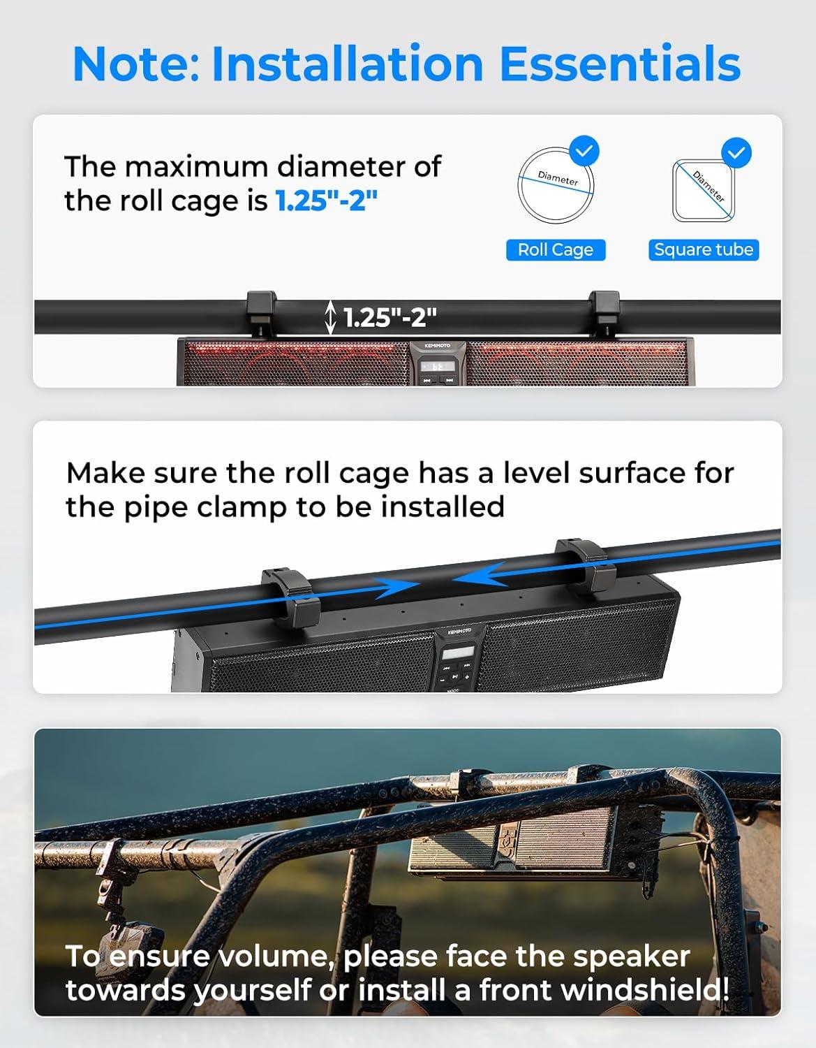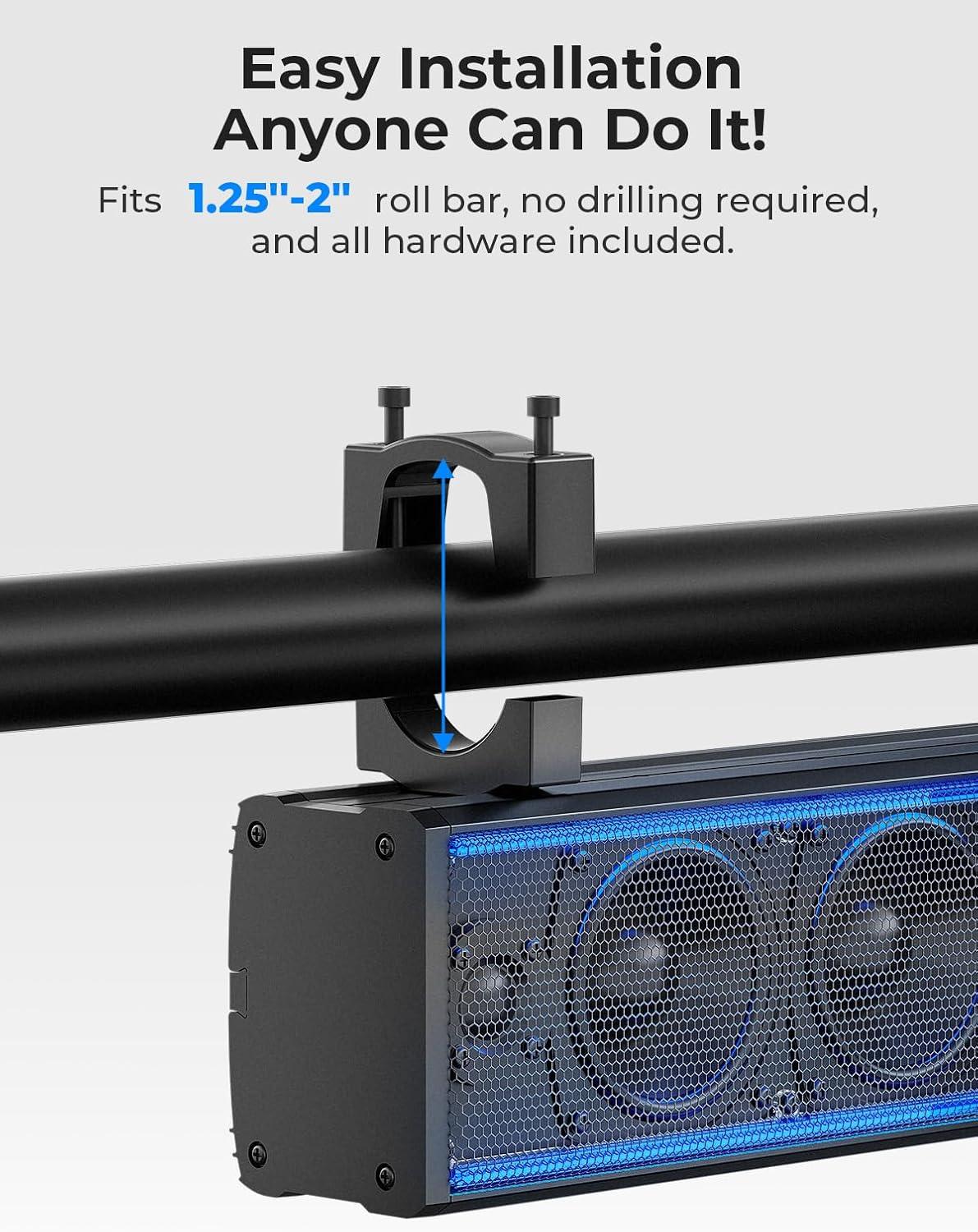 20 Minute Installation: No drilling needed, you can either mount it on the top or at the bottom. This waterproof utv soundbar can be mounted to any 1.25″ to 2″ roll bar cage of your UTV, ATV, Golf Cart, Marine Boat, only in 20 minutes