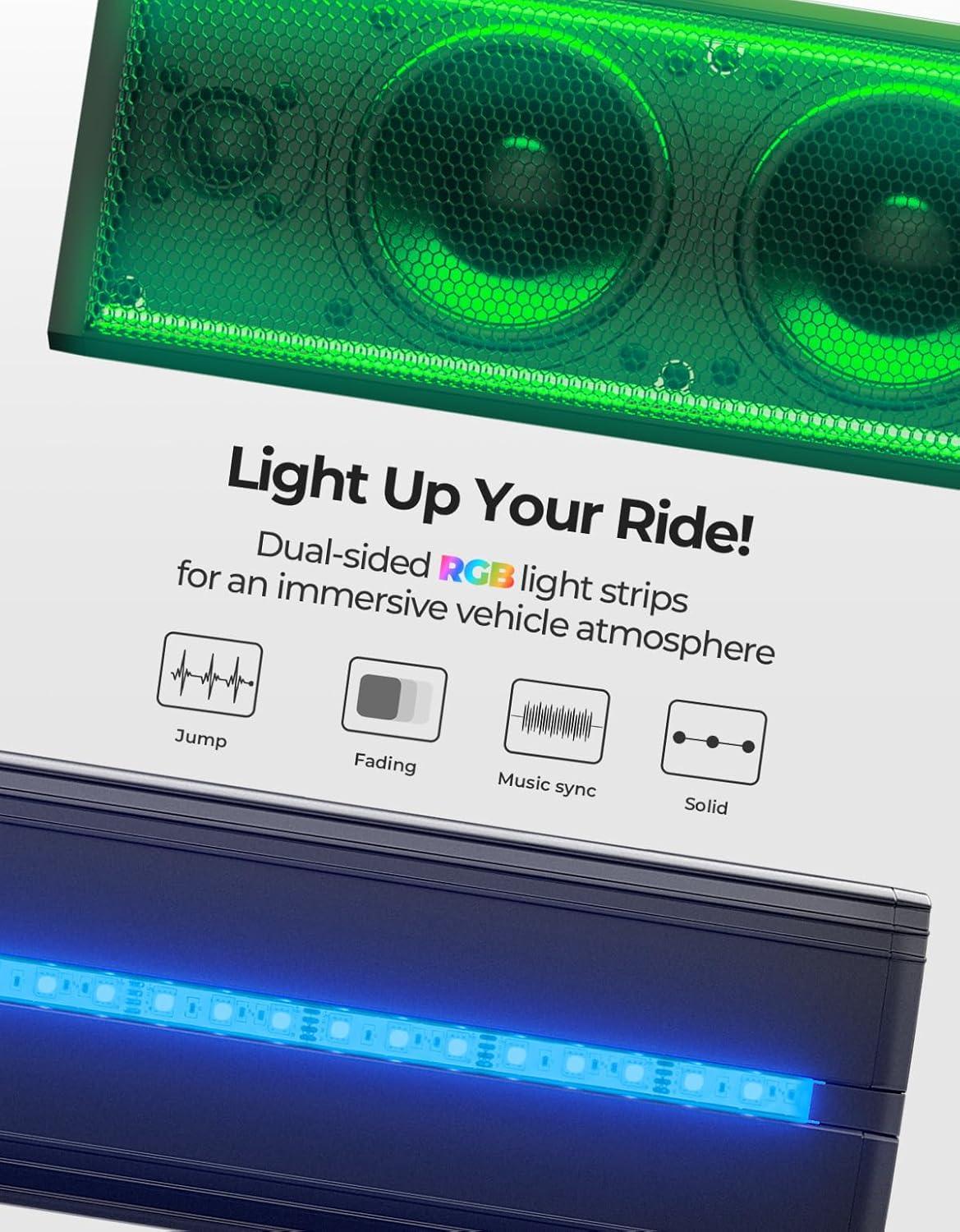 5 RGB Modes: Experience the ultimate audio and visual entertainment with our UTV soundbar with RGB Lights. There are 5 different RGB light modes (music sync, solid, fading, jump or off). Light in the sync mode beats and dances with the music, creating a truly immersive experience. You can customize your listening experience to match your mood