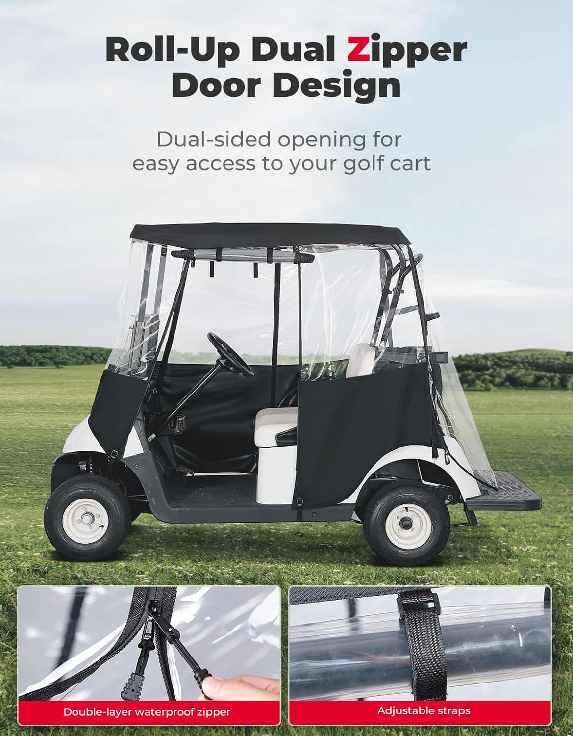 Dual Zipper Door Design: The Roll-Up Dual Zipper Door design facilitates the entry and exit of your golf cart. The rear zipper door design allows easy access to golf clubs in the golf bag