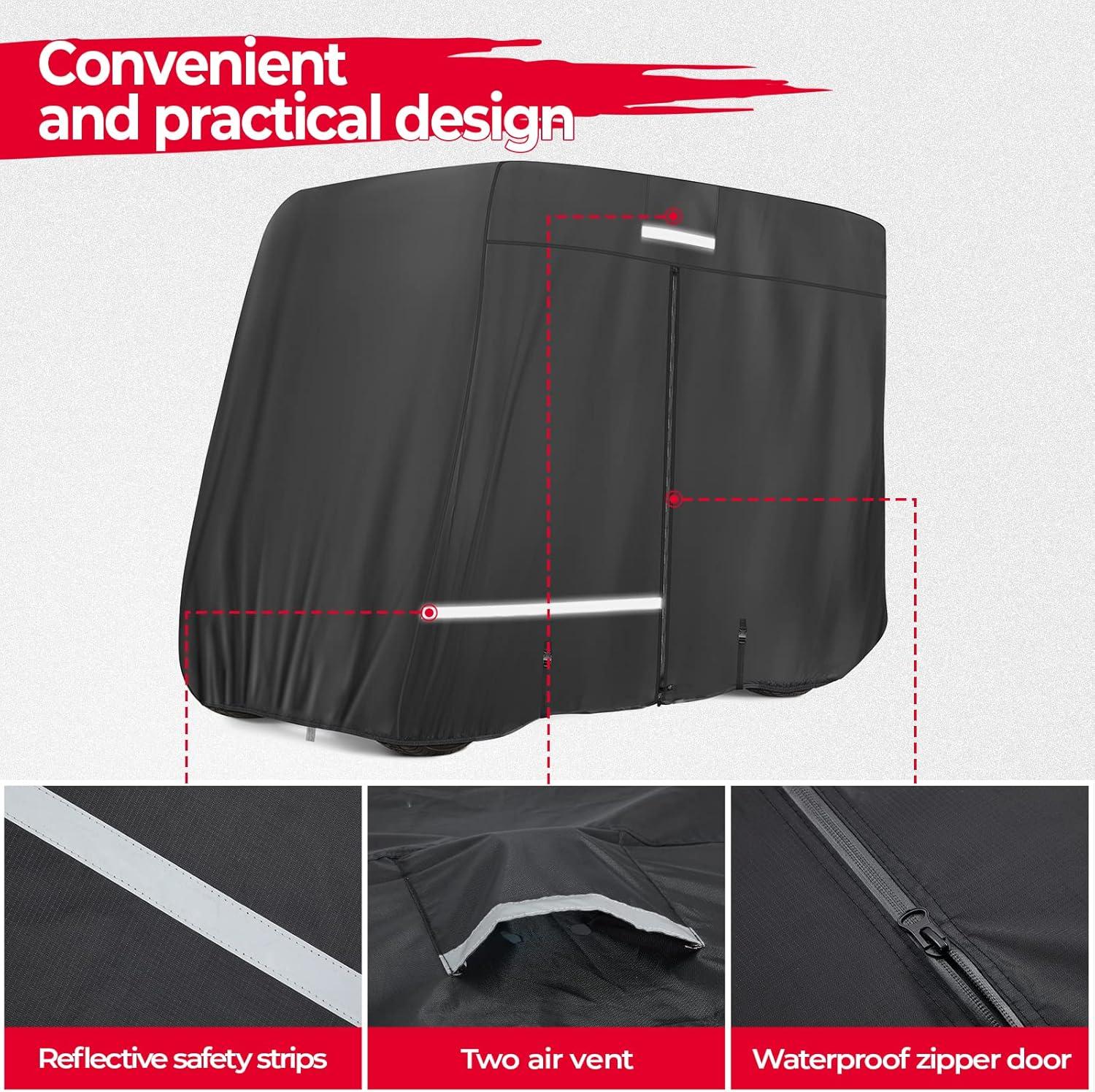 Universal Fit for Golf Carts: The size of the cover is 108″ L x 48″ W x 66″ H, universally fits most 2/4 passenger golf cart models, compatible with EZGO, Club Car, Drive and also suitable for golf carts equipped with the lift kit