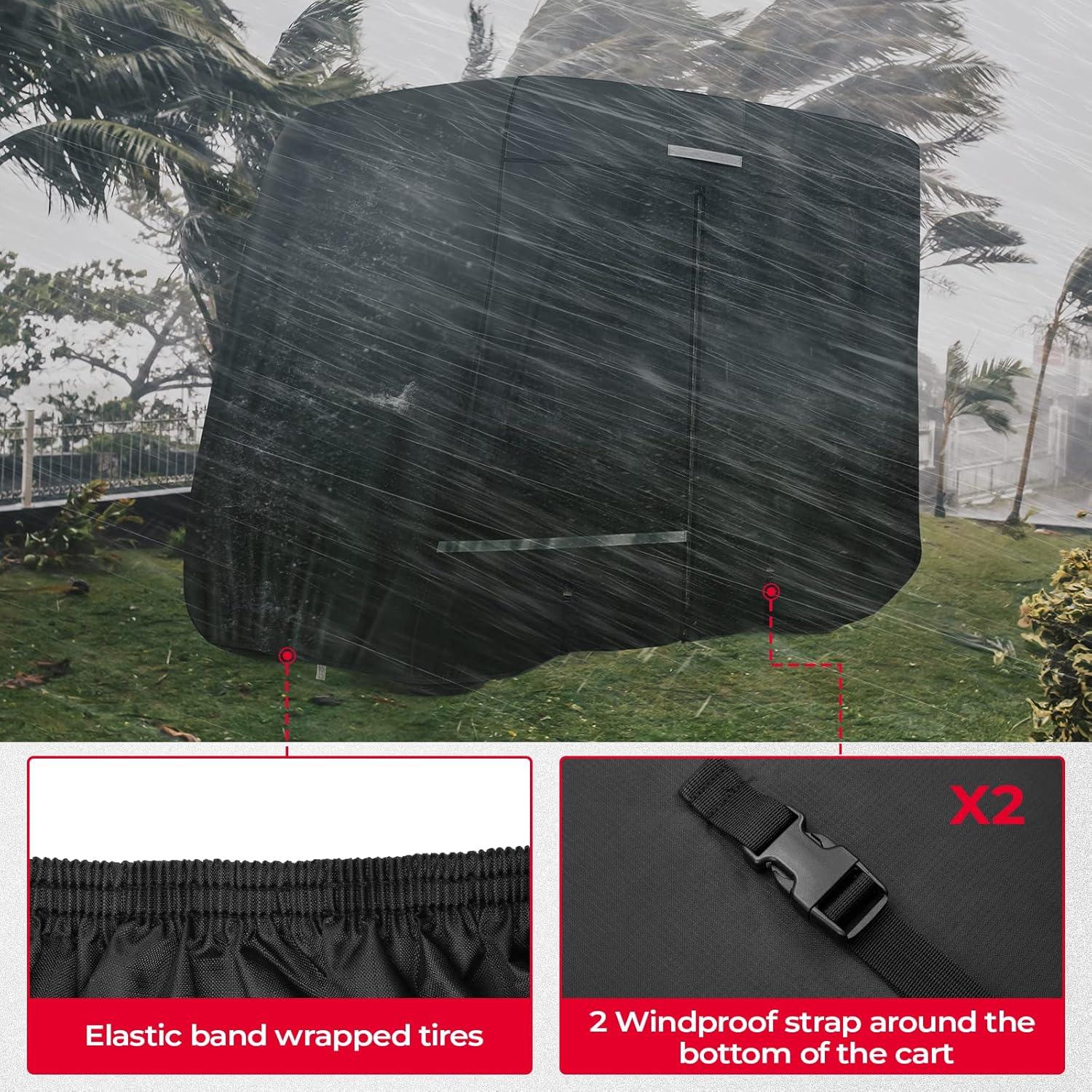 Excellent Waterproof and Windproof: The cover features dual waterproof coating and one Anti-UV coating, perfectly blocking rain and dust. The bottom of the cover is equipped with 4 elastic bands to wrap the wheels, and 2 bottom windproof straps keep the cover close to the golf cart, preventing high winds from blowing up the cover