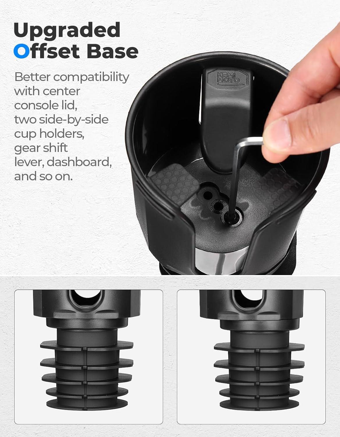 Advanced Adjustable Base: The KEMIMOTO cup adapter adapter now features an offset base, enhancing compatibility with gear shifts, center consoles, dashboards, and even dual expanders placed side by side