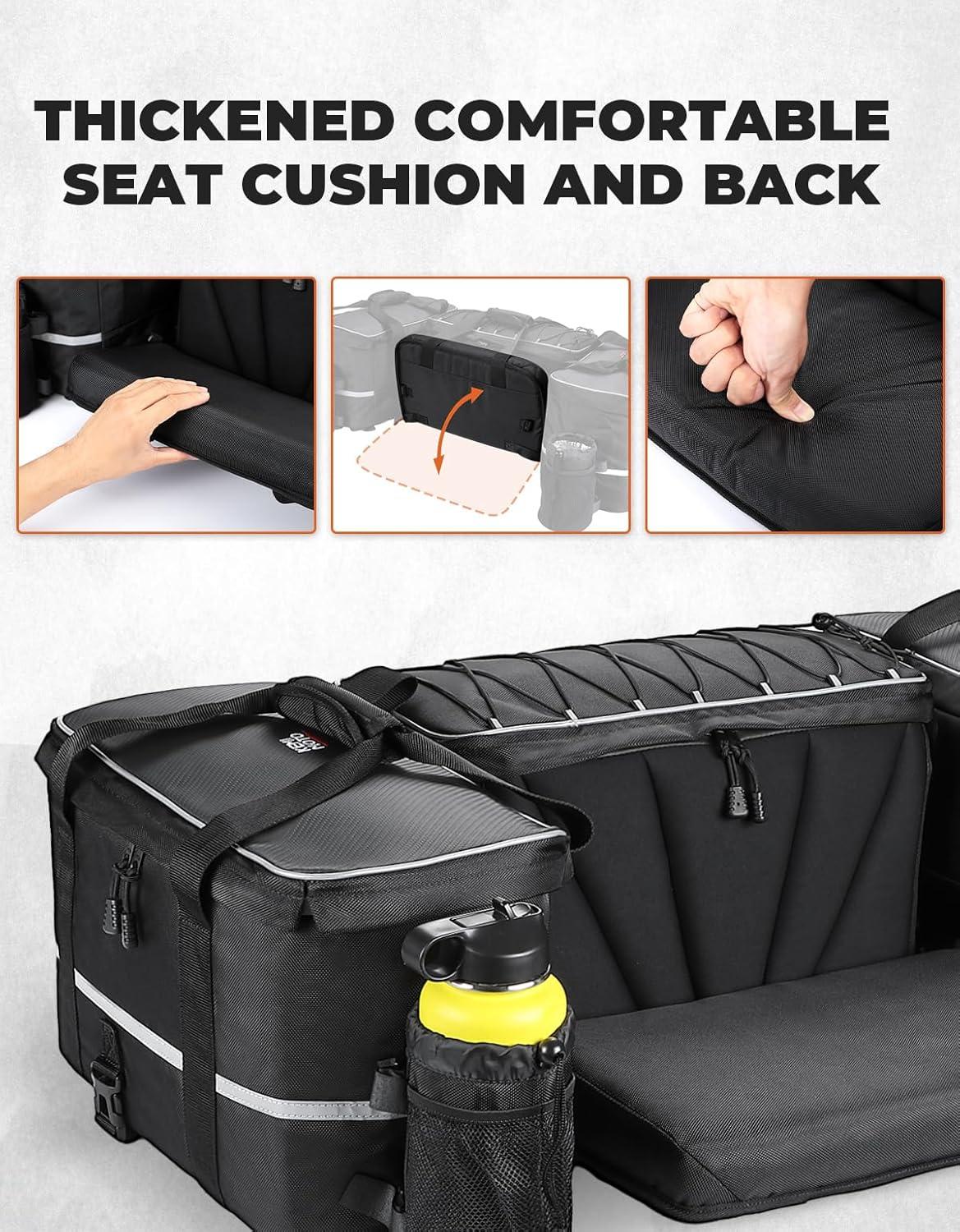 74L Large ATV bags: Kemimoto ATV storage bag has high capacity and consists of three universal storage bags and a cooler bag. The cooler bag can effectively keep your food or beverage cool in summer and keep them warm in winter for a few hours. Multiple nodes on the bag ensure the cargo bag is tightened firm and stable. And you can put water cups or sunglasses in two outside bags