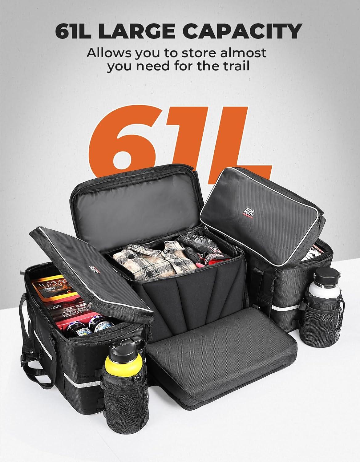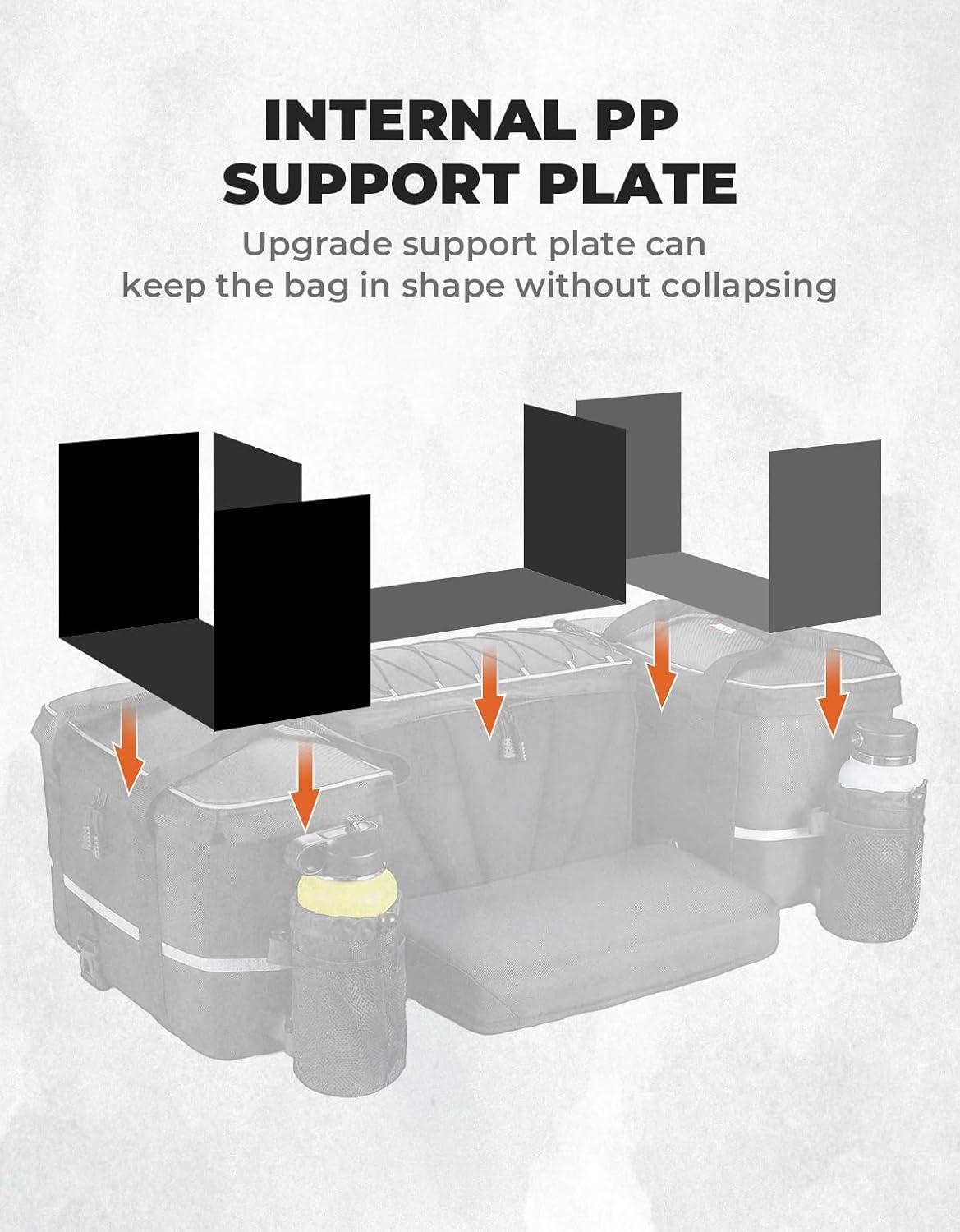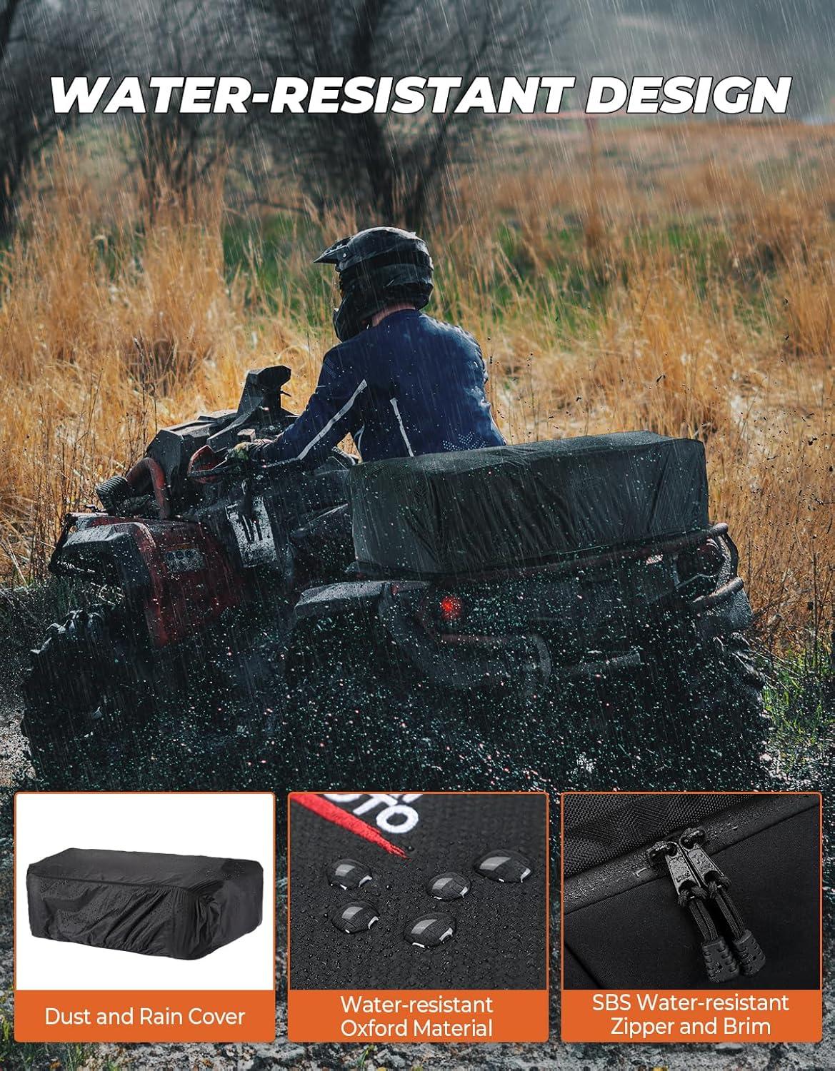 Upgraded Water-resistant Fabric & Cover : Kemimoto rear ATV padded bag used with TPU Water-resistant fabric helps no one drop of mud, water, or dust get inside, which effectively reduces the burden of cleaning after the journey and ensures your supplies inside are clean and dry. The separately equipped rain cover makes the protection more comprehensive, not exposed, and no need to be afraid of any dust, mud, dirt, or debris