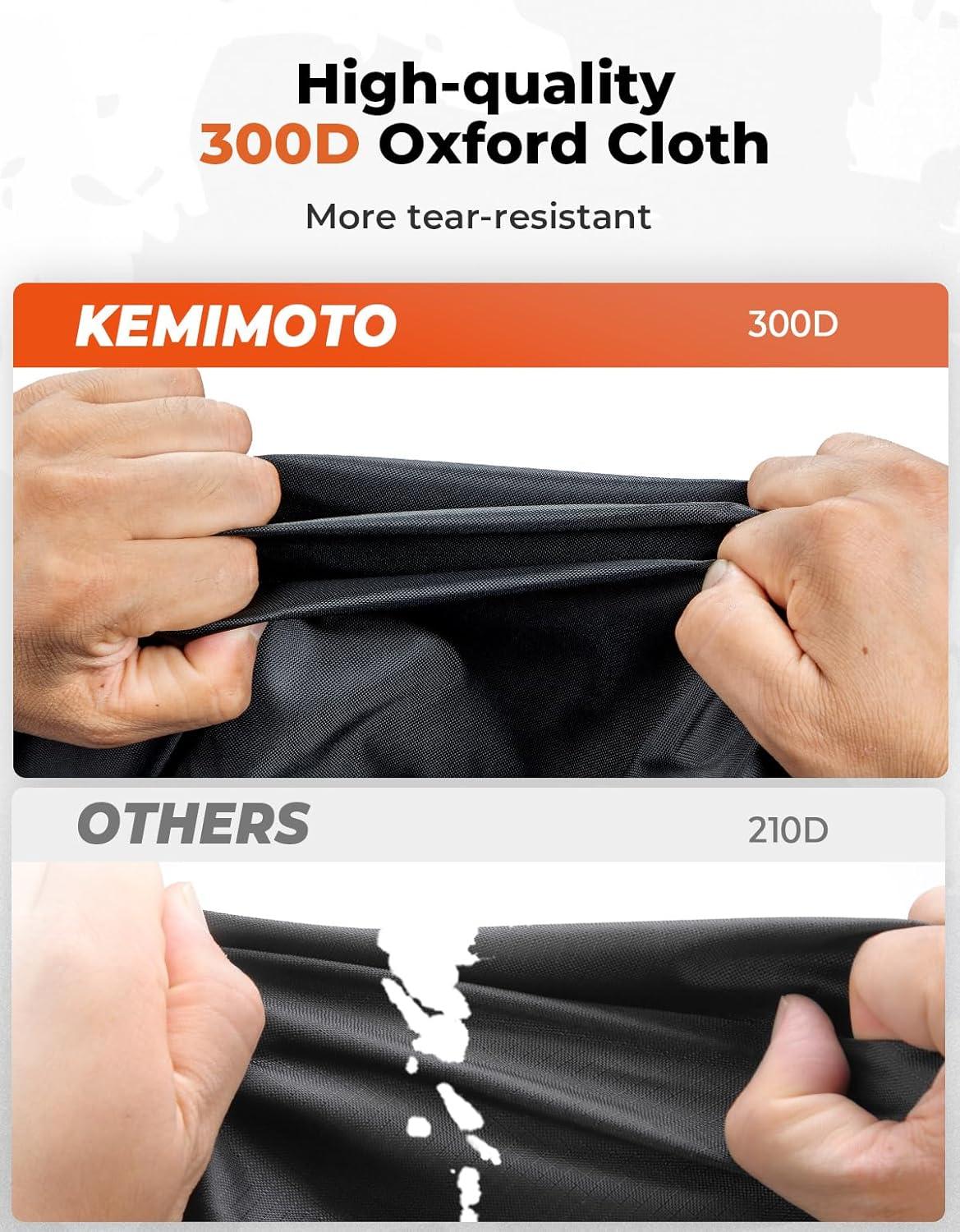 Durable Oxford Fabric and No More Tearing: KEMIMOTO Universal ATV cover made of upgraded 300D Oxford fabric, which is heavy-duty, water-resistant, and anti-tearing, can give improved protection for your vehicles away from faded plastics and racks from rain, wind, sun, and snow