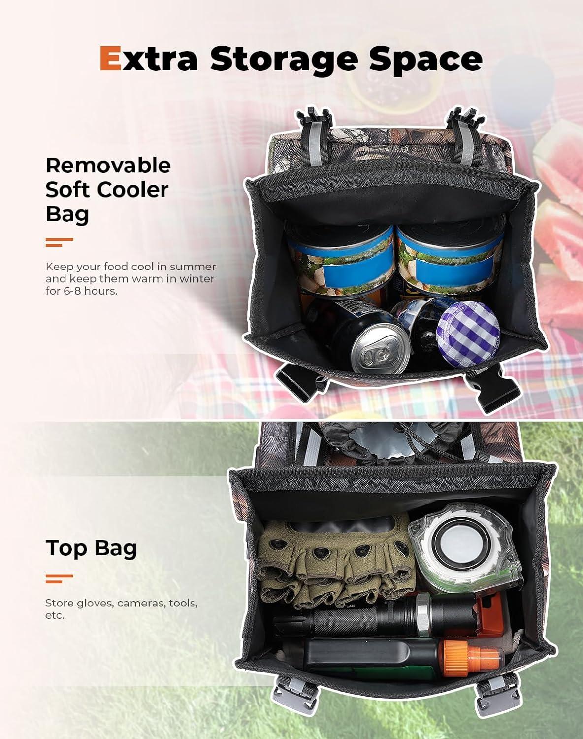 Large Storage Space: The upper bag can store gloves, cameras, and other items, and the elastic straps in it can fix glasses, keys, tools, etc, the detachable lower bag with aluminum foil can keep your food cool in summer and keep them warm in winter for 6-8 hours; no-zipper design can maximally open the bag, and then you can get items easier and faster