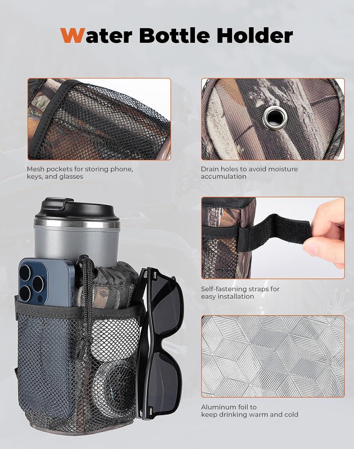 Water Holder: The water holder with aluminum foil can keep your drink cool in summer and keep them warm in winter for 6-8 hours. It can be installed on both sides of the bag according to your needs; the bottom of the water holder has round holes for draining