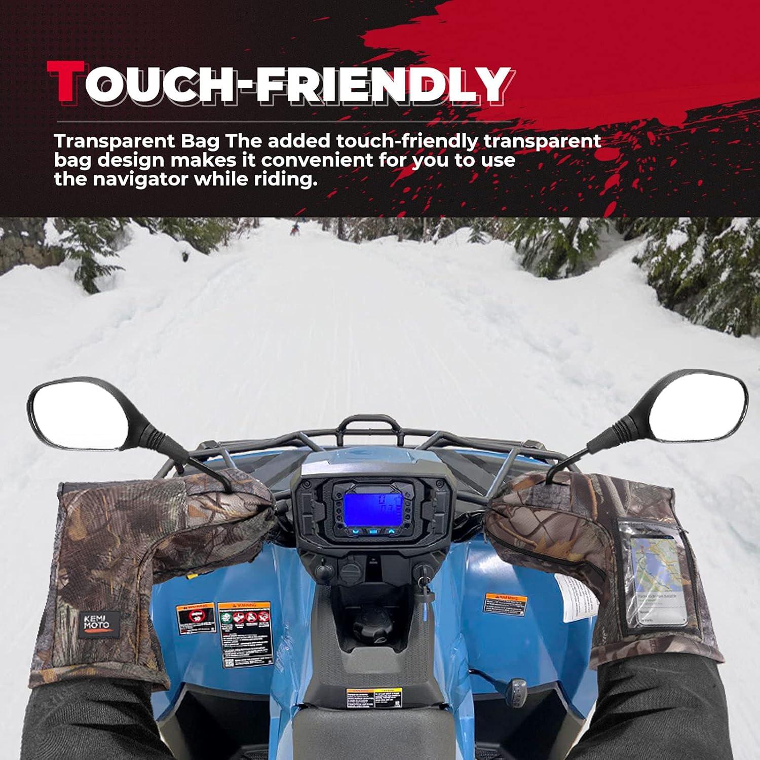 Touch-friendly transparent bag: KEMIMOTO ATV mitts add a Touch-friendly transparent bag design to make it convenient for you to watch your phone or navigator. ATV hand warmers make your journey easier! KEMIMOTO handlebar muff is compatible with Polaris Sportsman Can-Am Outlander Arctic Cat snowmobile ATV accessories