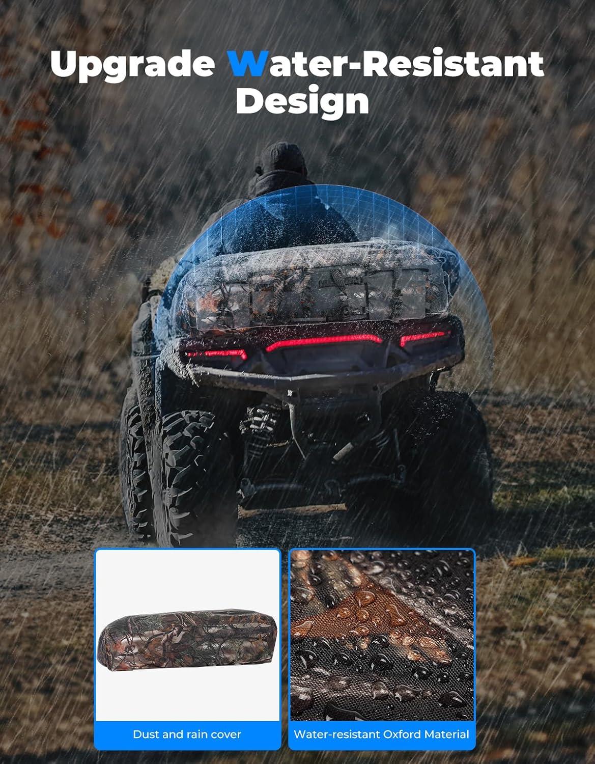Water-resistant Fabric & Cover : The rear ATV padded bag used with TPU Water-resistant fabric, which effectively reduces the burden of cleaning after the journey and ensures your supplies inside clean and dry. The separately equipped rain cover makes the protection more comprehensive, not exposed, and no need to be afraid of any dust, mud, dirt, or debris