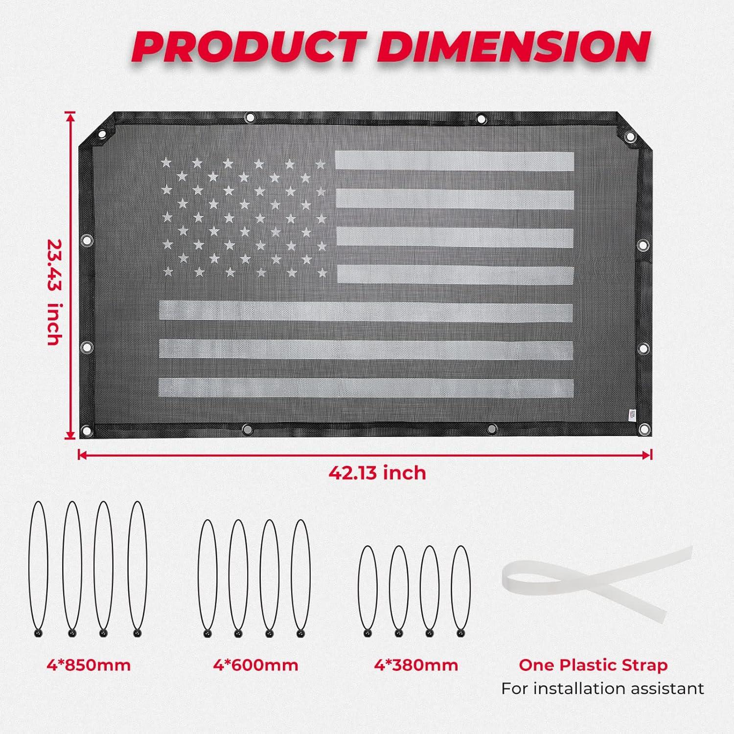 Old Glory Flag Print & Not Block the Rear View: Kemimoto rear net is printed with the Old Glory Flag. The U.S. Flag net makes your UTV more attractive, displaying your patriotism and showing your pride. **Reminder** Looking out from inside the vehicle, our mesh screen will not obstruct your rear view because of the white invisible flag print. Compared with others with color print on the market, our net will ensure transparent view and your safety to quickly observe the surroundings
