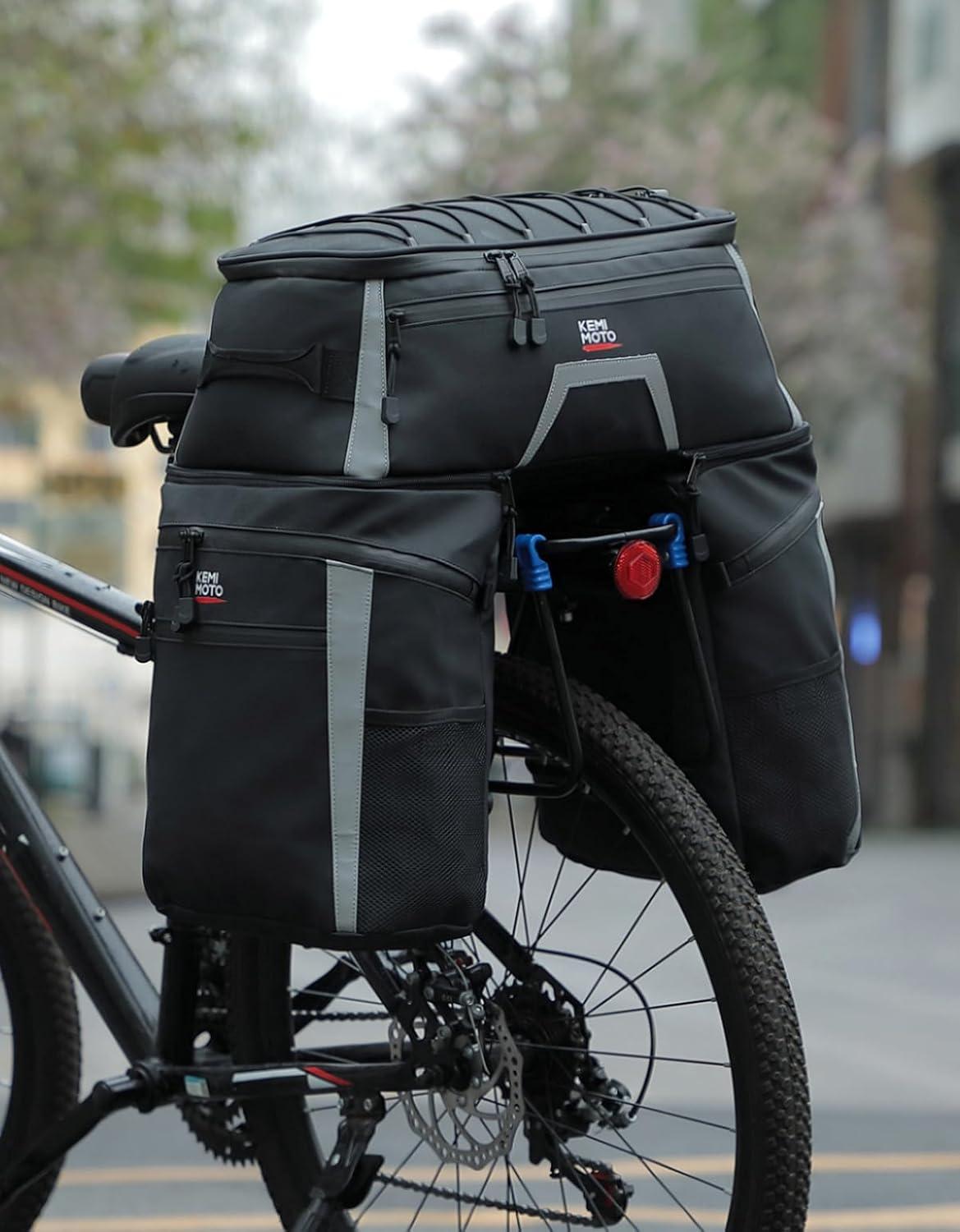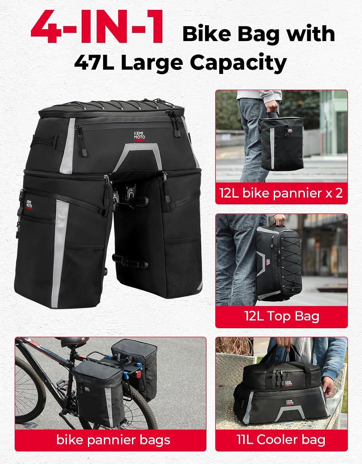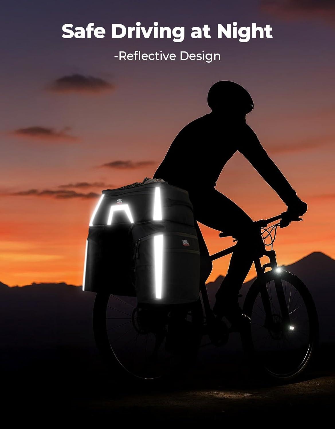 3-in-1 Combo: The bicycle panniers provide a generous total capacity of 52L, consisting of two 17L spacious side panniers and a versatile 18L detachable top backpack. They are ideal for multi-day trips, accommodating camping gear, clothes, and food