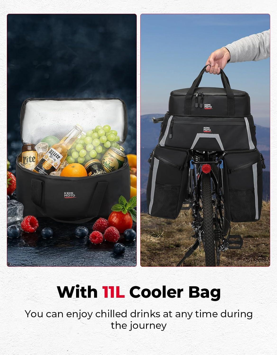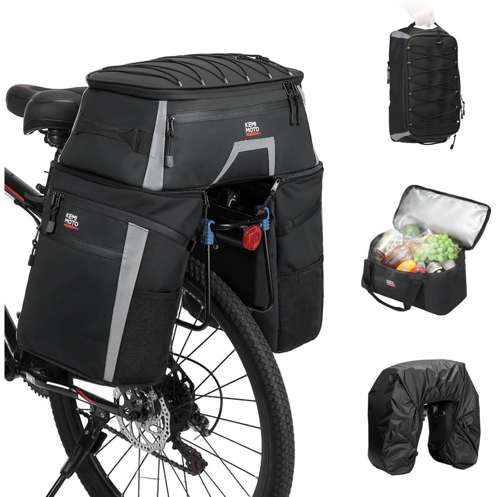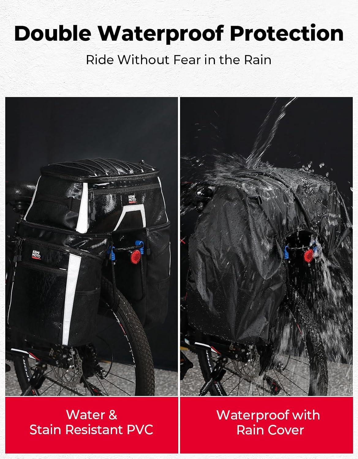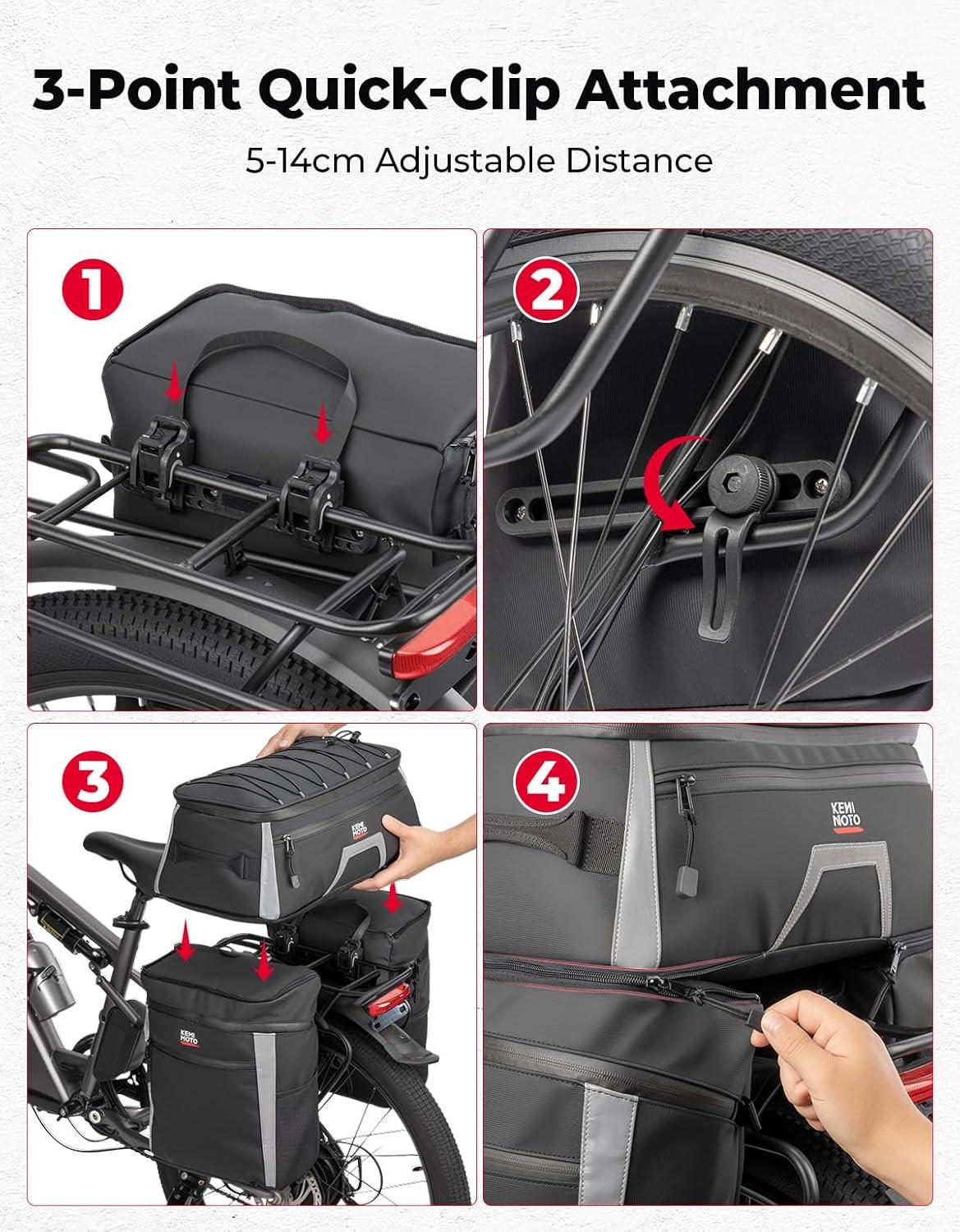 3-in-1 Combo: The bicycle panniers provide a generous total capacity of 52L, consisting of two 17L spacious side panniers and a versatile 18L detachable top backpack. They are ideal for multi-day trips, accommodating camping gear, clothes, and food