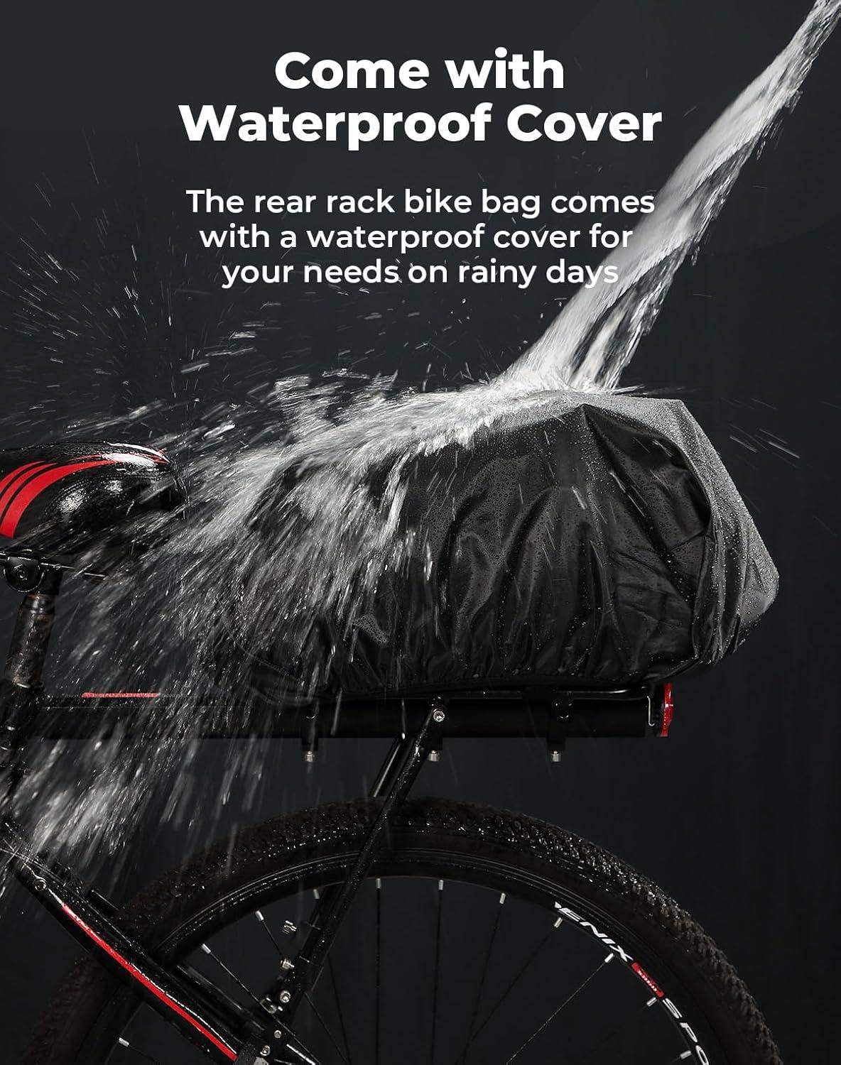 Water Resistant: The Bike Rear Rack Bag is made of water-resistant and smooth PVC Oxford and leather fabric. The seams are not waterproof. Avoid prolonged outdoor exposure to rain and direct sunlight when not in use