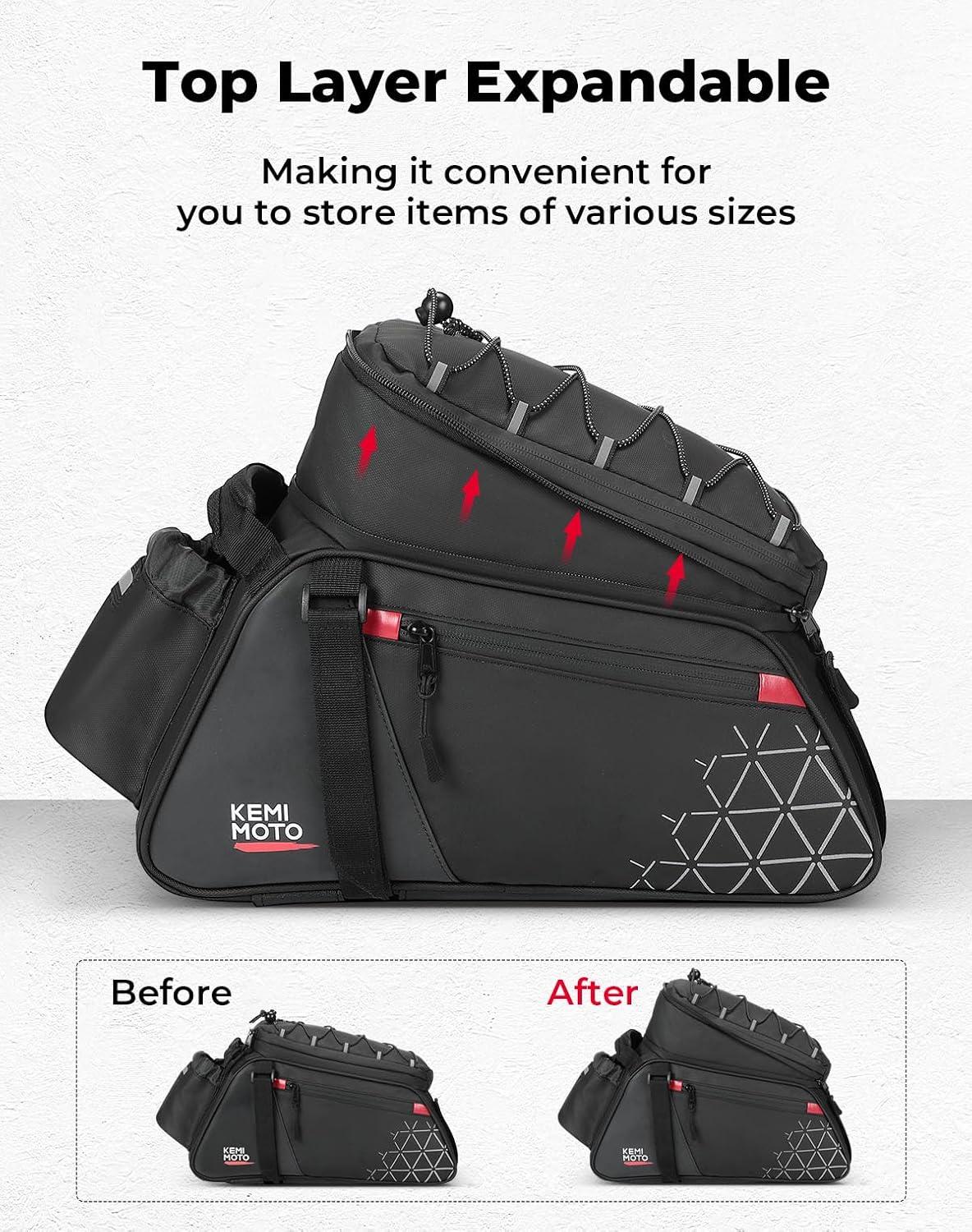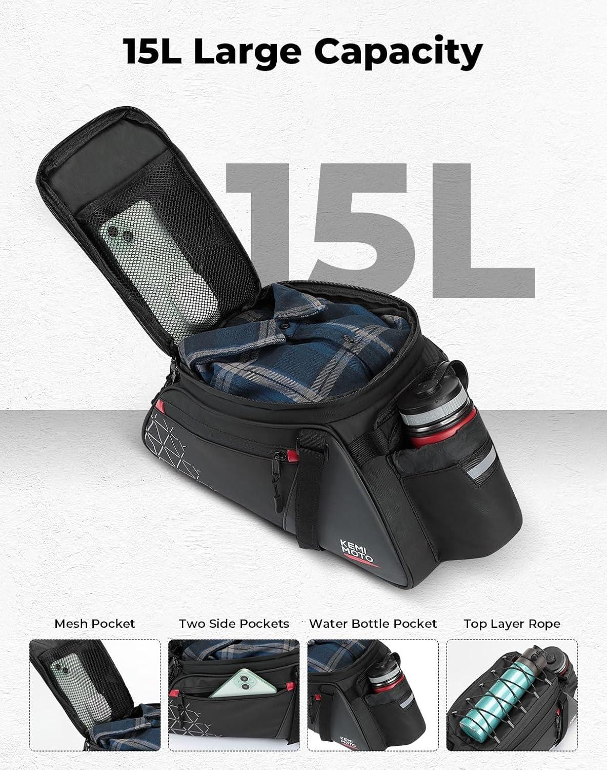 Lightweight Bike Bag: The KEMIMOTO bike rear rack bag has an overall capacity of 15L. A tie rope has been added on the top for extra storage, along with additional zipper pockets on the side and a hidden pocket underneath for a chest strap
