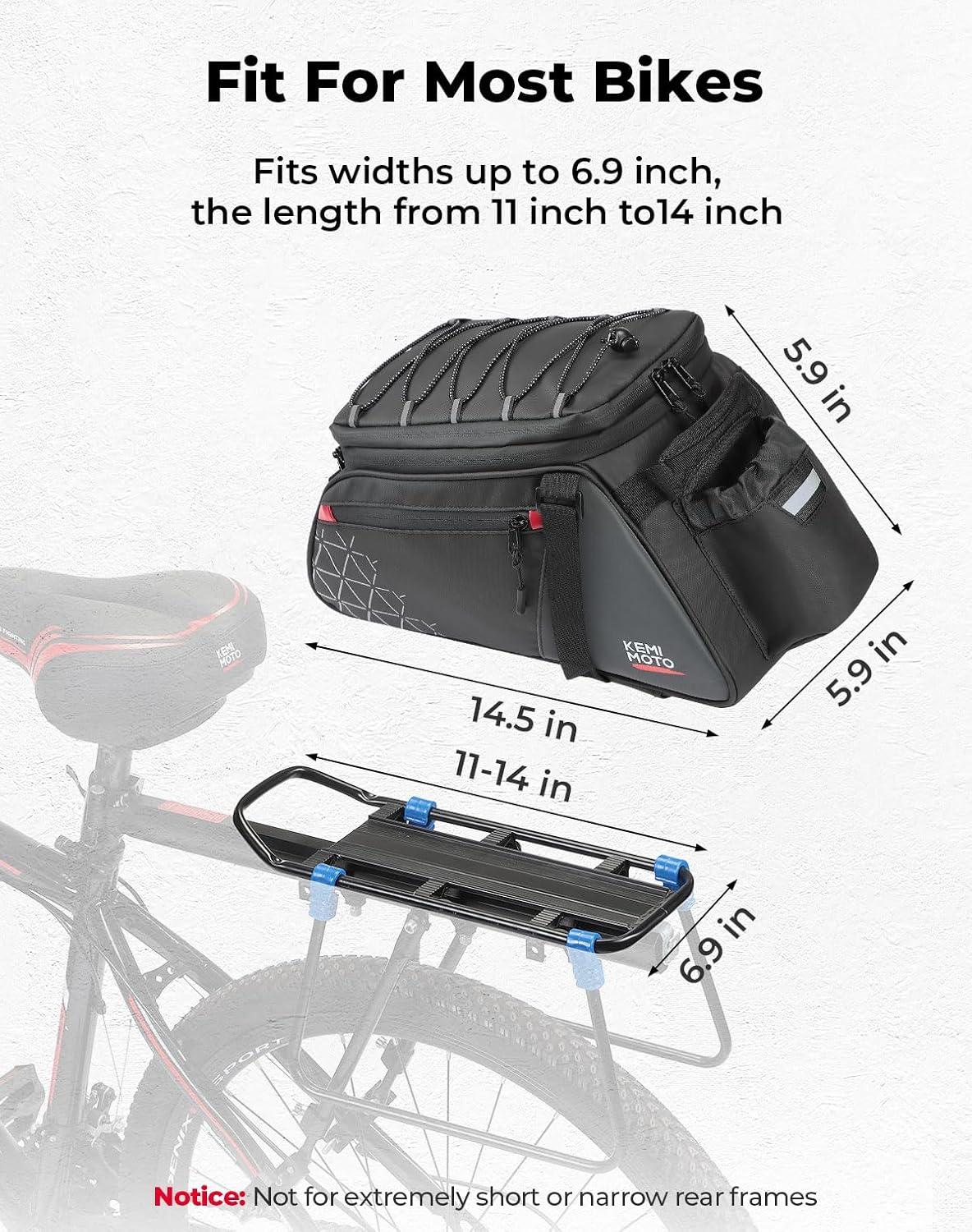 Easy to Install: It has 3 strong sticker straps to attach to the rear rack to prevent the bag from sliding while riding. Usually, it takes few minute to install. Fits widths up to 6.9 inches and the length from 11 inches to14 inches. (Notice: not for extremely short or narrow rear frames)