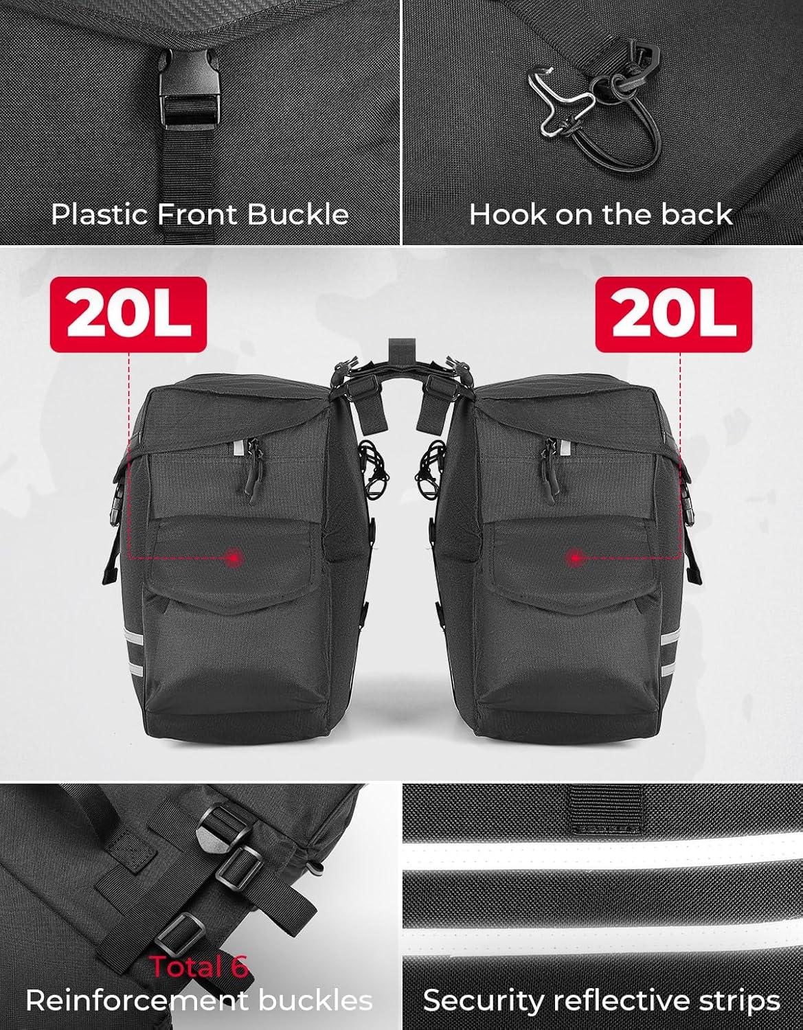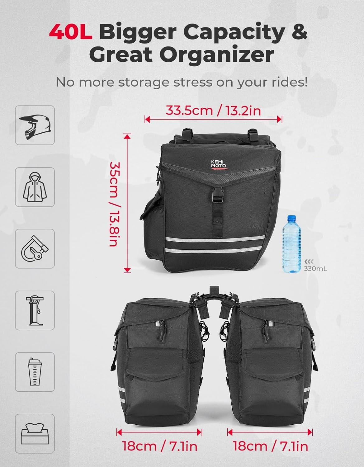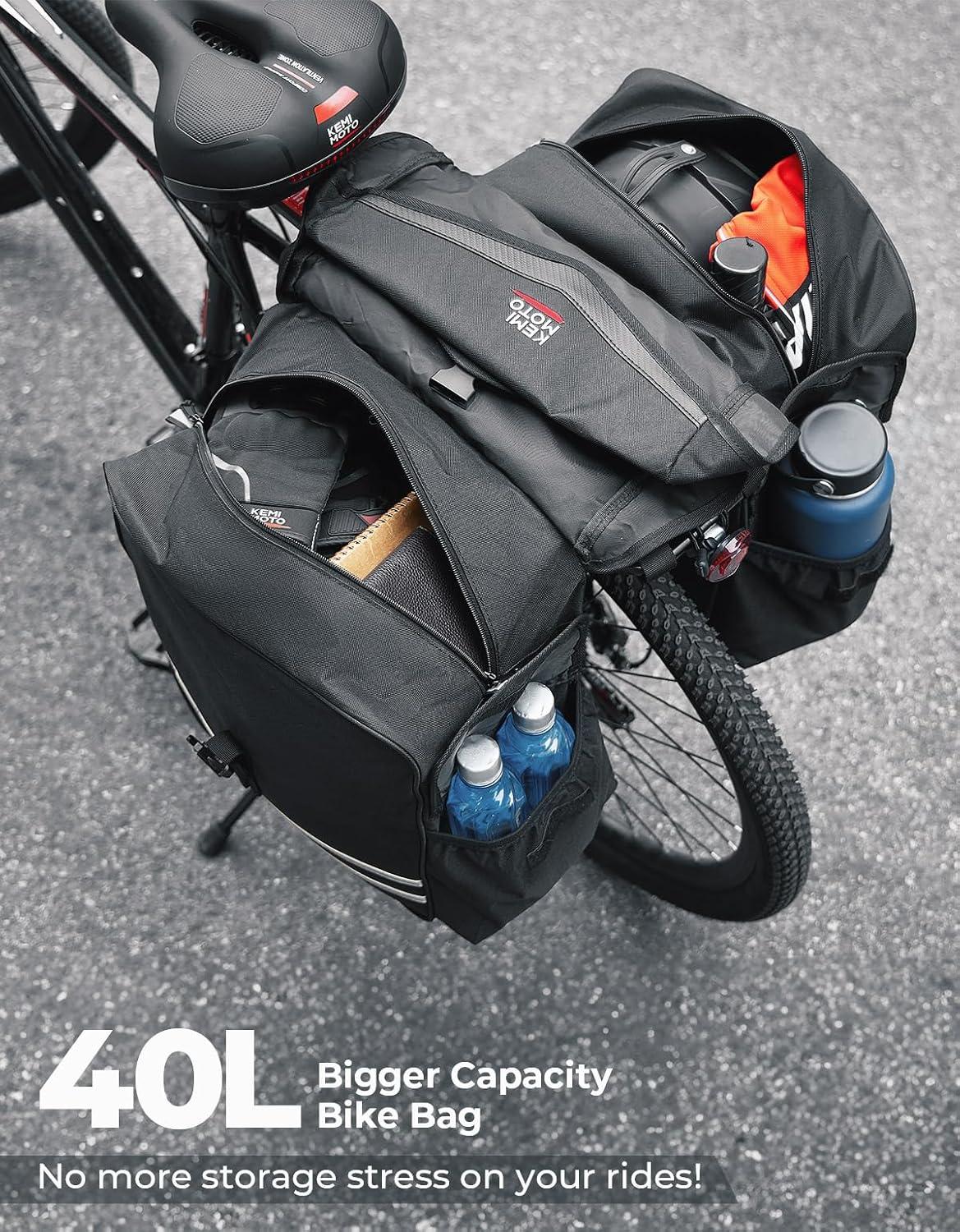 40L Large Storage Capacity, Carry More: This KEMIMOTO bike panniers has a 40L capacity, with each side holding 20L. Each bag features two main compartments and water bottle pockets. Ample space for daily essentials, gear, and plenty of food and drinks. Ideal for grocery shopping, commuting, outdoor picnics, and long trips