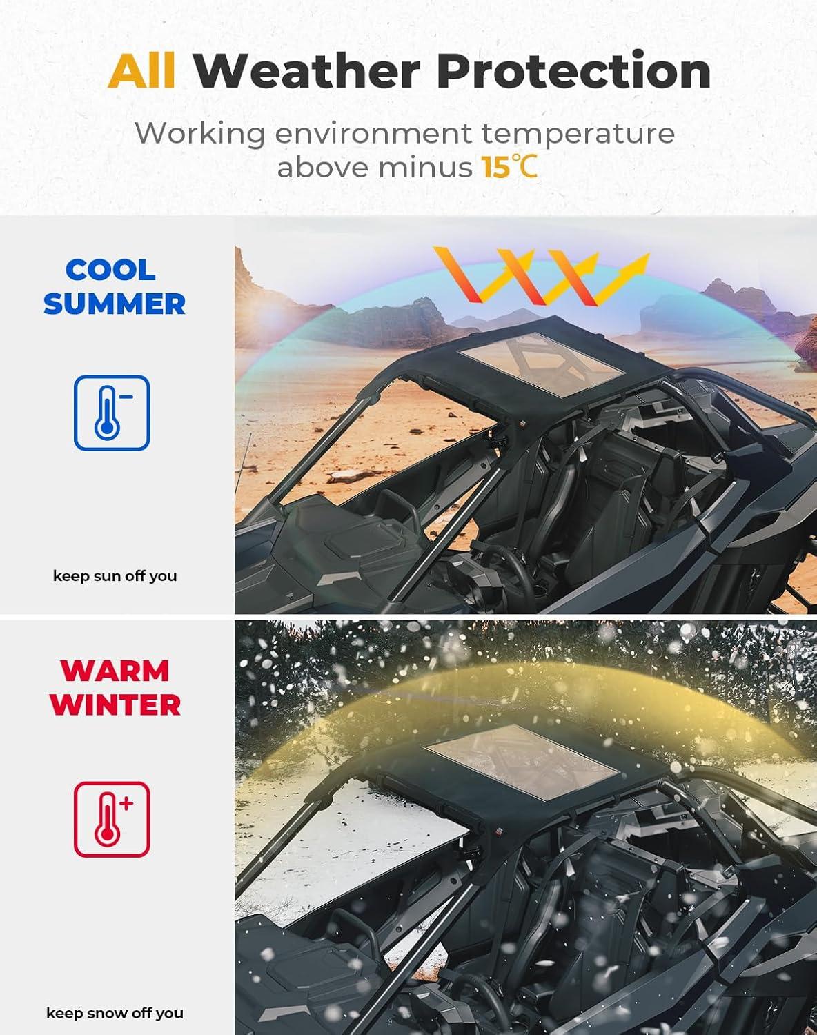 Easy Install Top: Installation is straightforward and drill-free; it can be quickly fastened with hoop and loop straps onto the existing rooftop frame.NOTE:To prevent sagging, tighten the straps to the sides. The non-slip design ensures they stay secure once fastened
