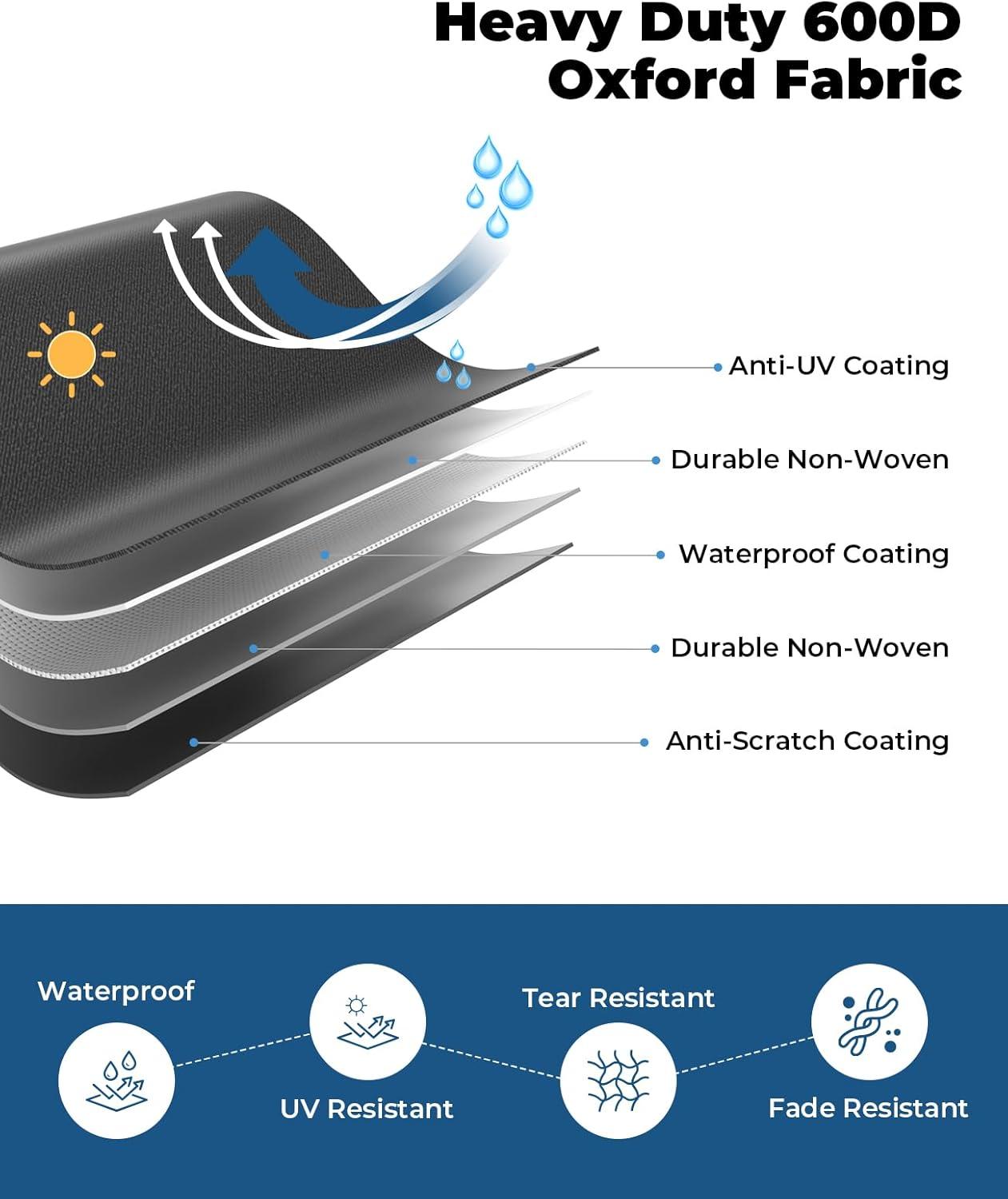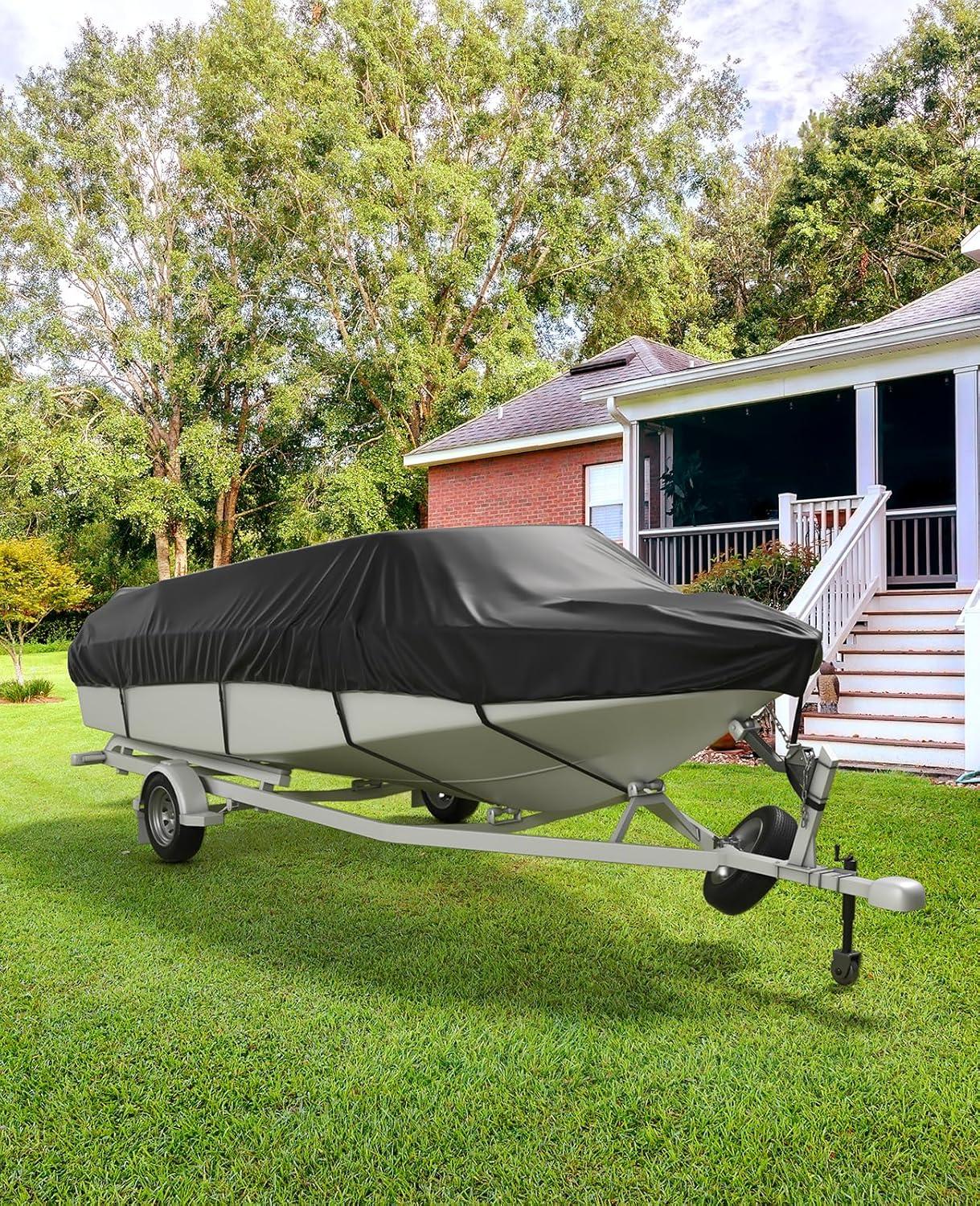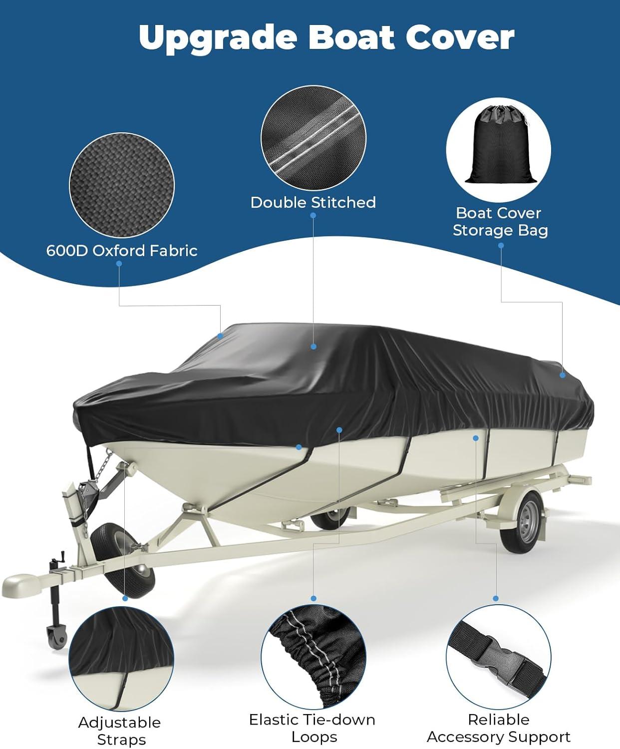 【Ultimate Protection】Crafted from robust 600D oxford fabric, our boat cover offers unparalleled protection for your vessel. With waterproof and UV-resistant properties, it effectively shields your boat from the elements, ensuring long-lasting durability in all weather conditions.
