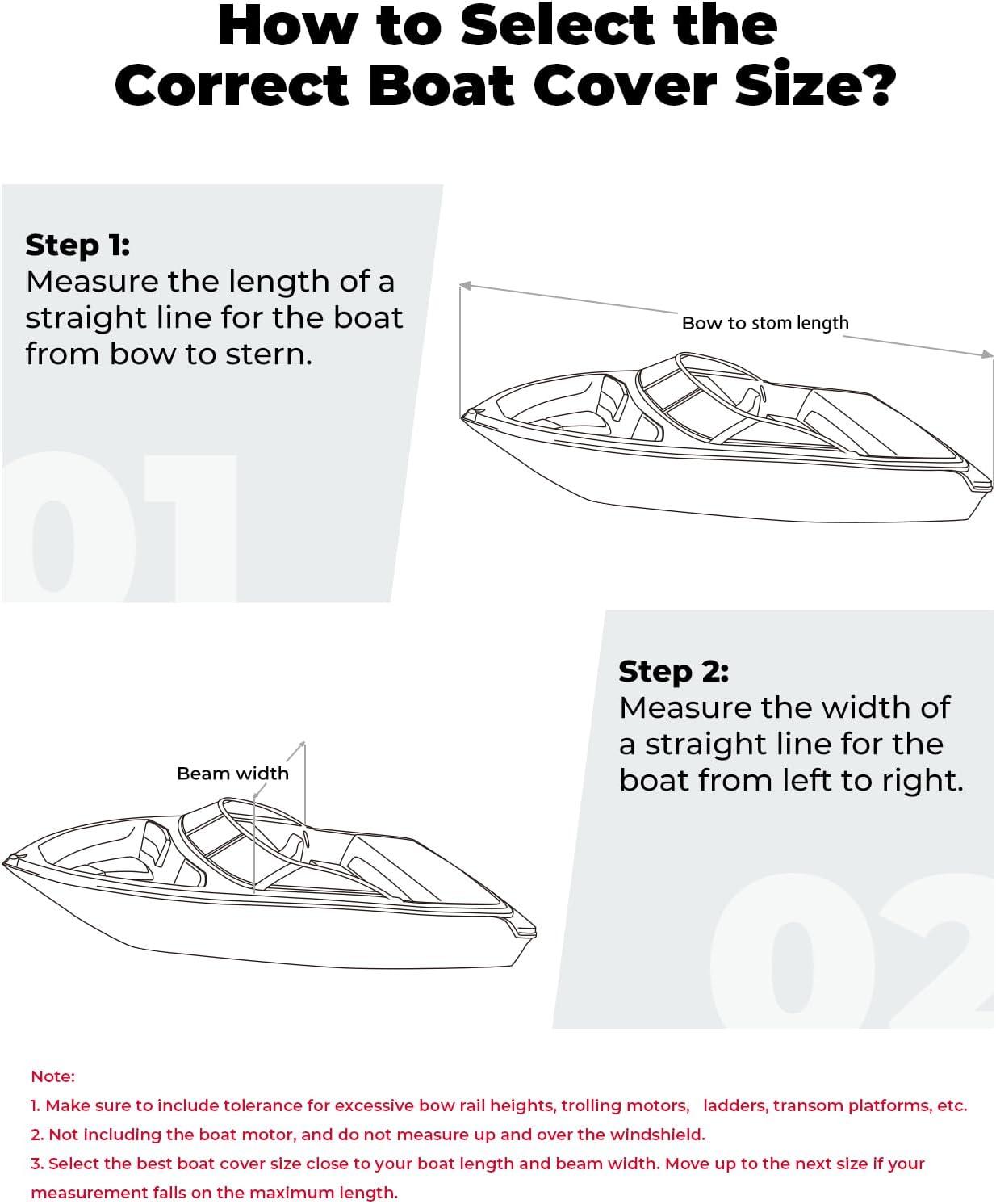 【Select the Correct Size】Choosing the correct boat cover size is crucial for optimal protection. Refer to our detailed size chart to ensure a perfect fit for your vessel. Accurate measurements of your boat’s length, width, and height are essential.